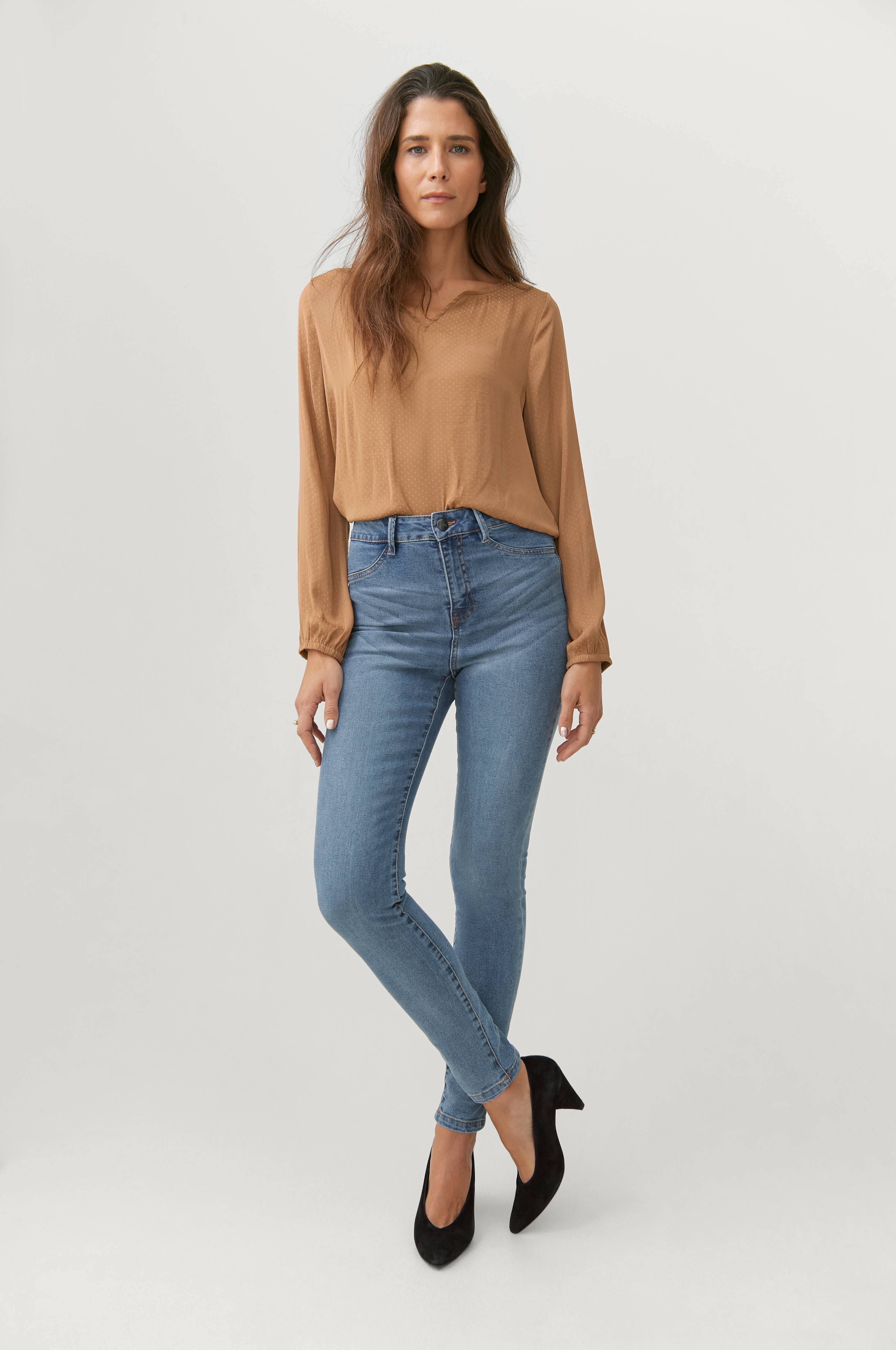 Bluse BrianaSZ LS Blouse fra Saint Tropez i tynd, vævet satin med glans og vævede strukturprikker. V-udskæring og lange ærmer med elastiske ærmekant. Blusen er noget længere bagpå.
