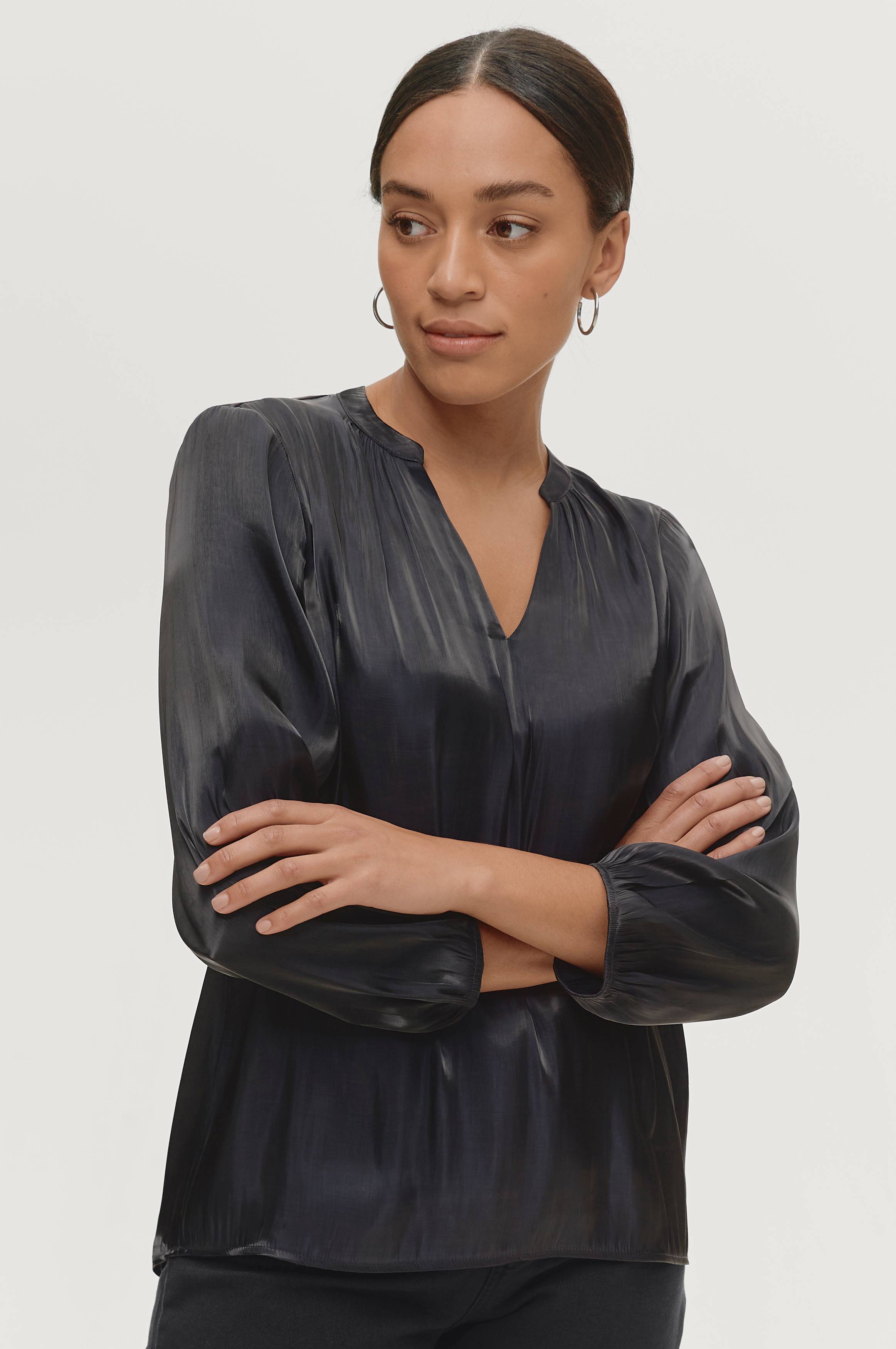 Bluse CadySZ Blouse fra Saint Tropez i vævet, blank kvalitet. 3/4-lange ærmer med elastiske ærmekanter og v-udskæring med rynket søm langs nakken og foran.