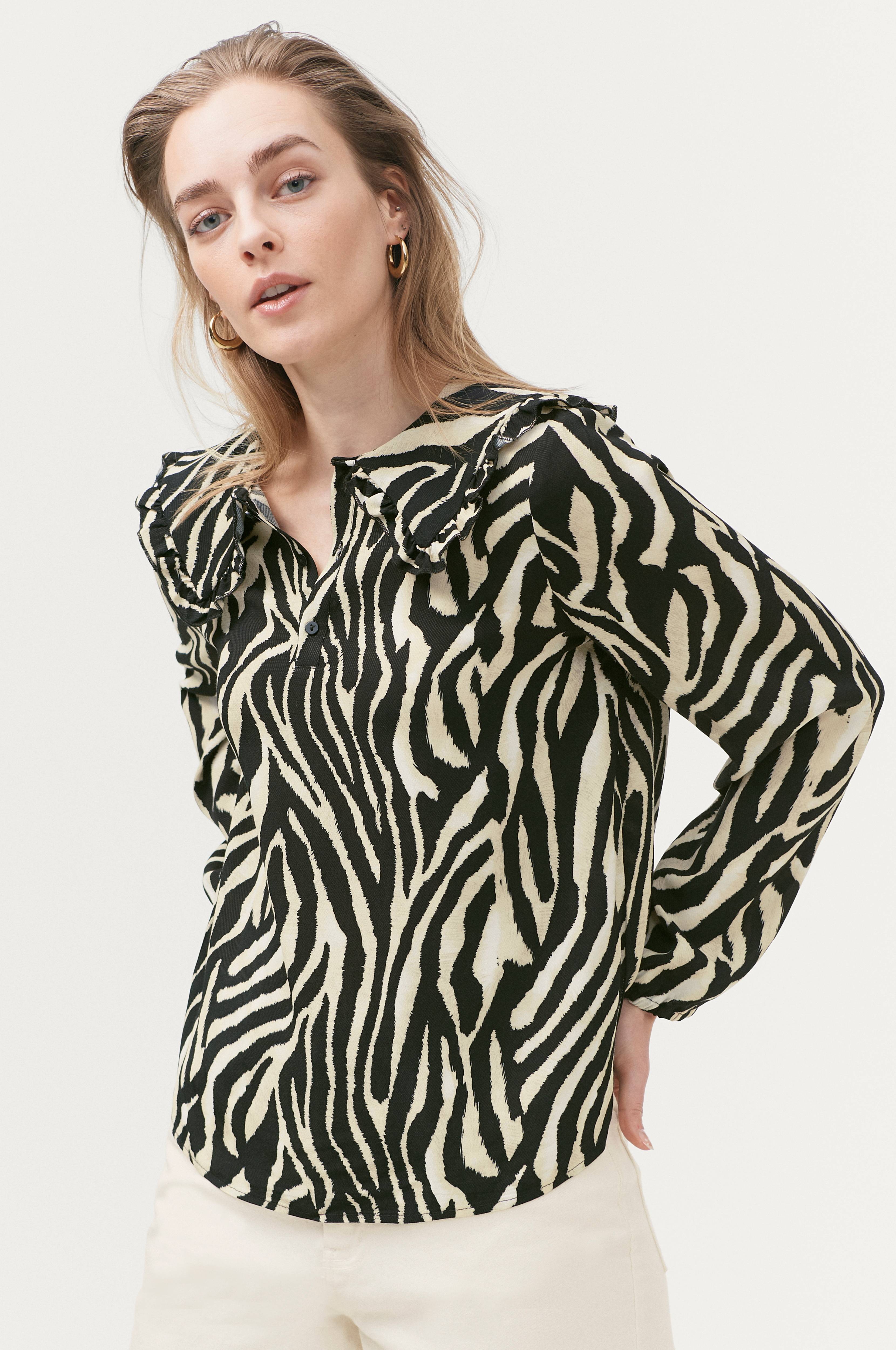 Lige model med stor krave som har påsyet flæsekant rundt om. Kort stolpelukning i hals og langt, lige ærme med indsat elastik i ærmekant.