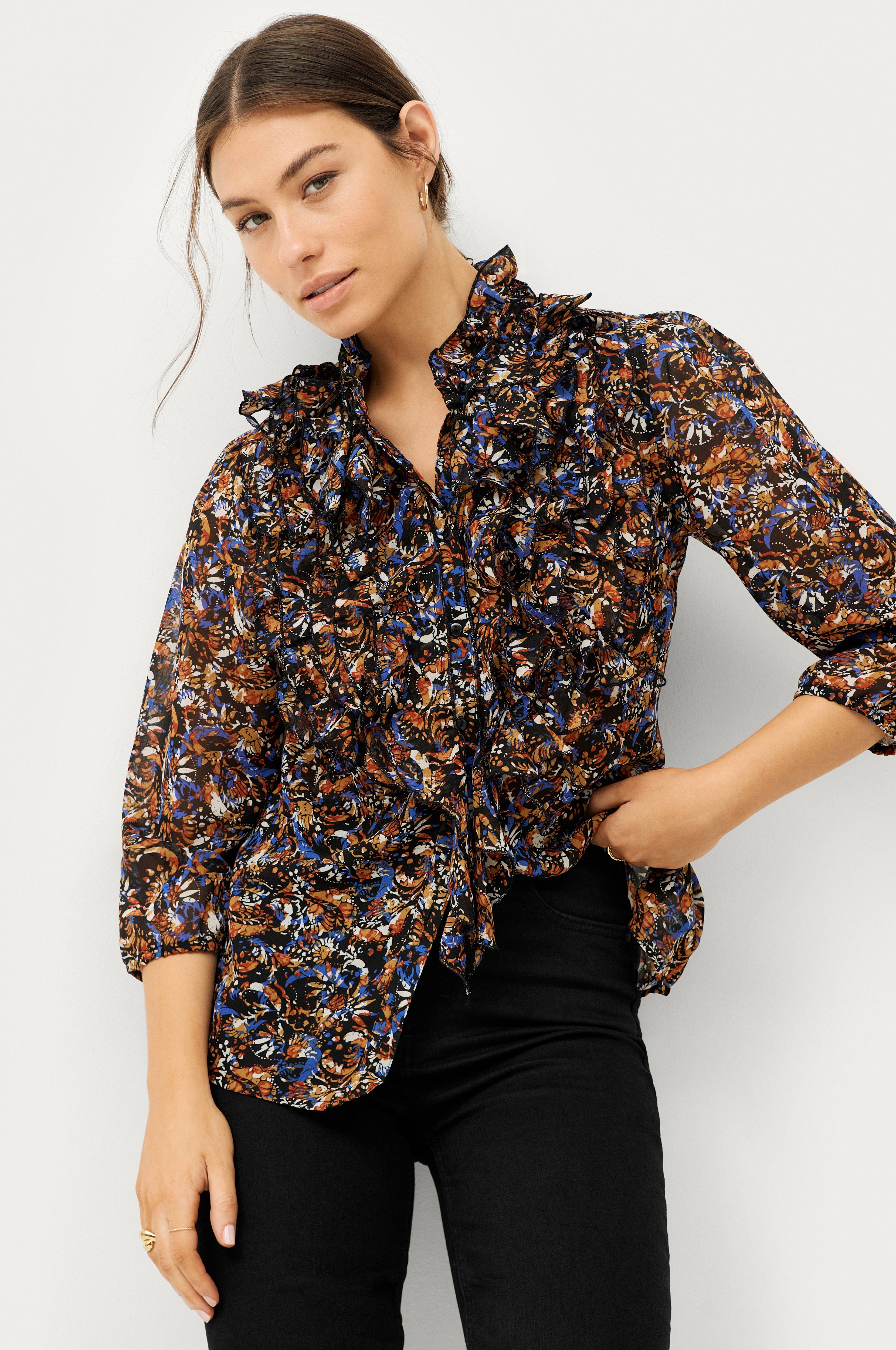 • Fremstillet af chiffon• Rund hals med volanter• Volanter på brystet• Lige, 3/4 langt ballonærme med elastisk manchet