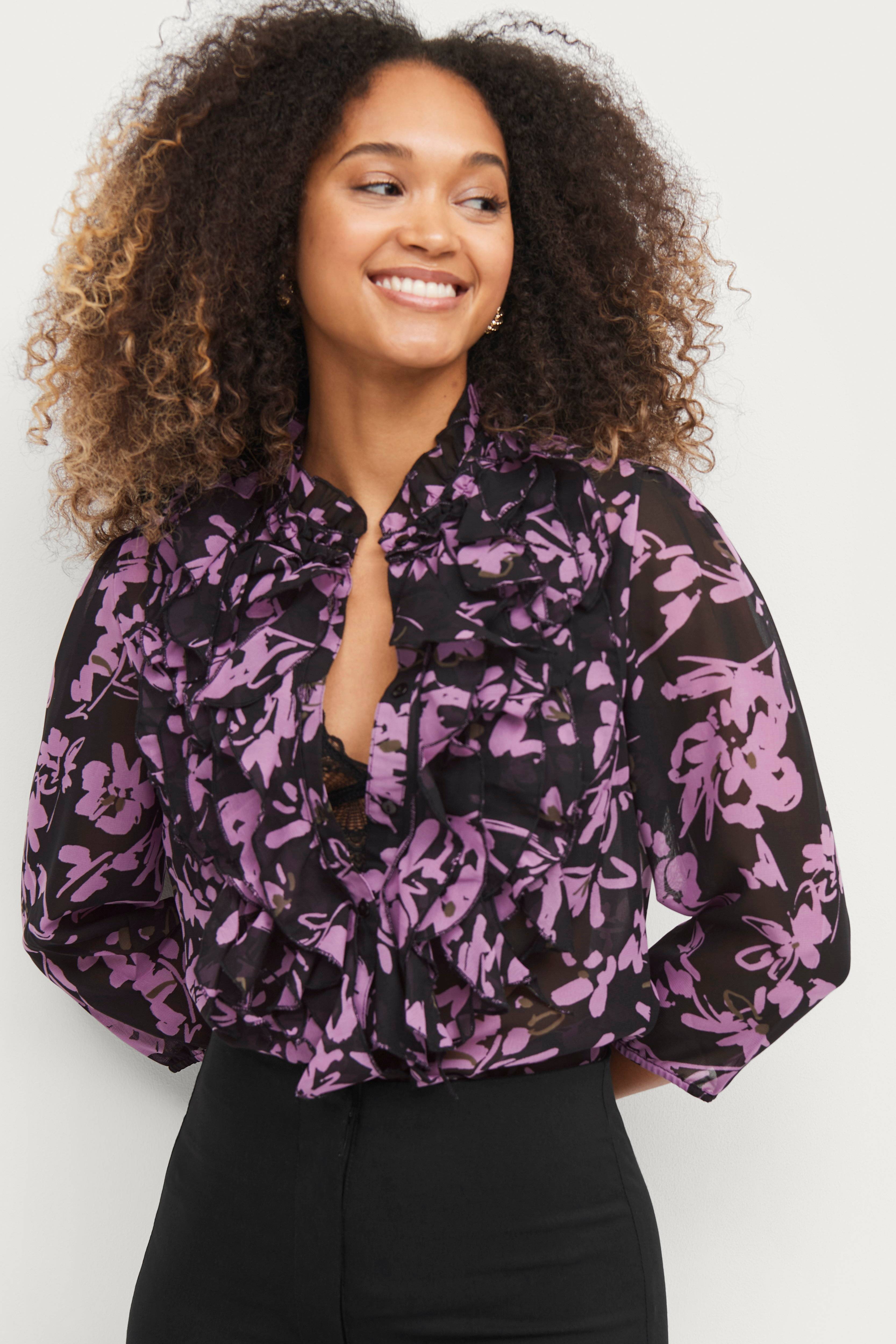 • Fremstillet af chiffon• Rund hals med volanter• Volanter på brystet• Lige, 3/4 langt ballonærme med elastisk manchet
