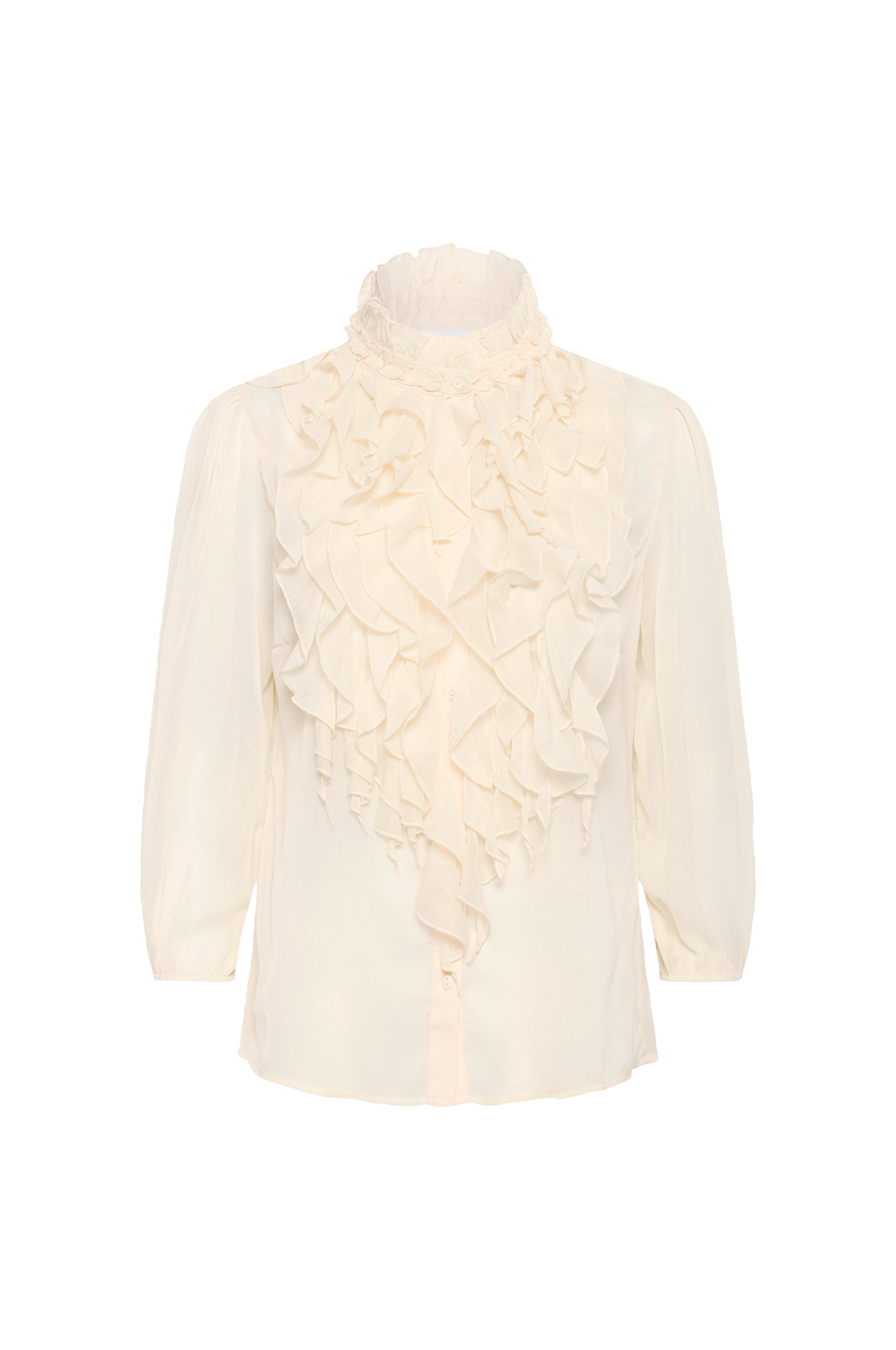 • Fremstillet af chiffon• Rund hals med volanter• Volanter på brystet• Lige, 3/4 langt ballonærme med elastisk manchet