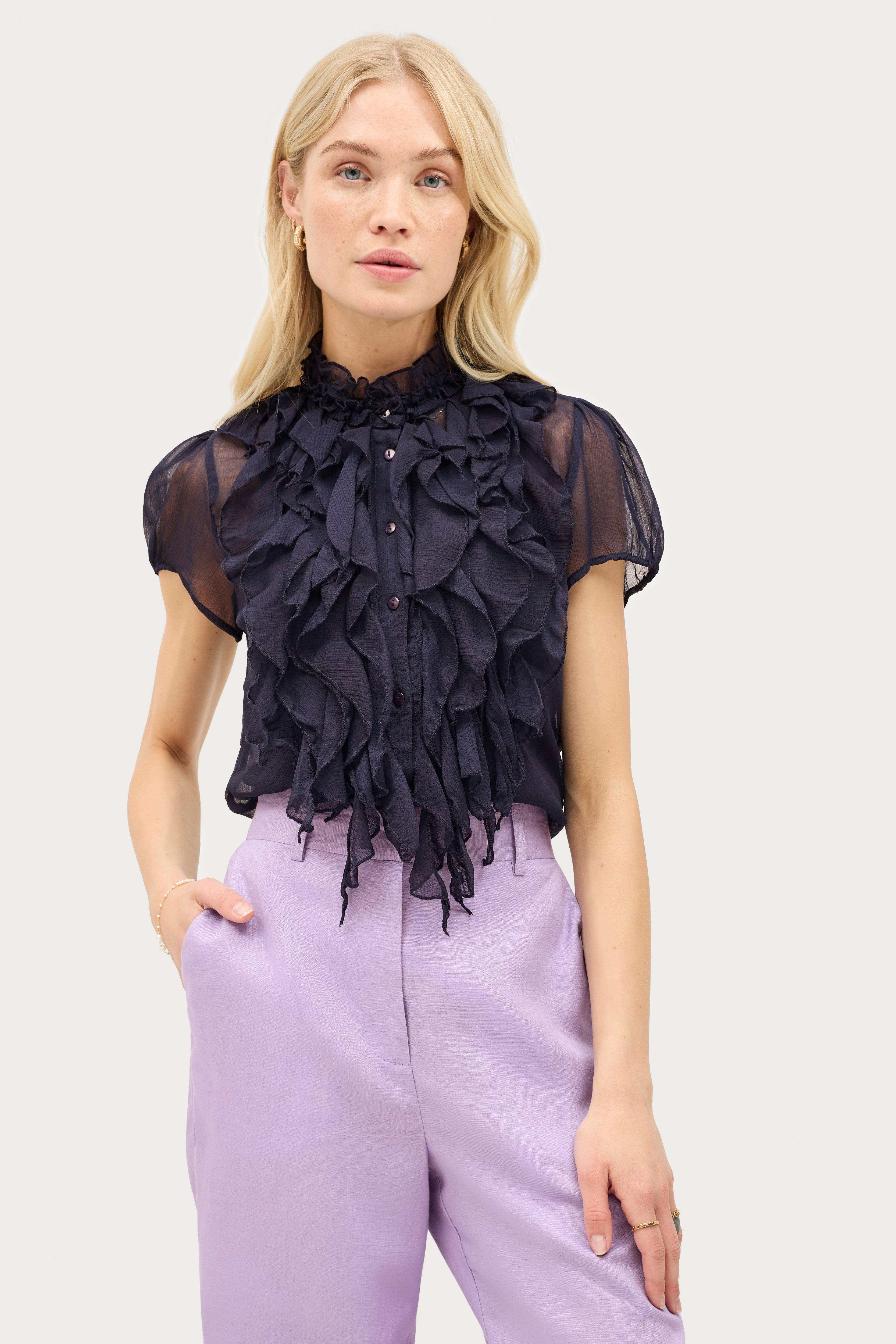 Farven (rød-hvid spættet) er virkelig lækker, og sammen med flæserne gør det blusen til en rigtig festbluse uden at se for klovneagtig ud.