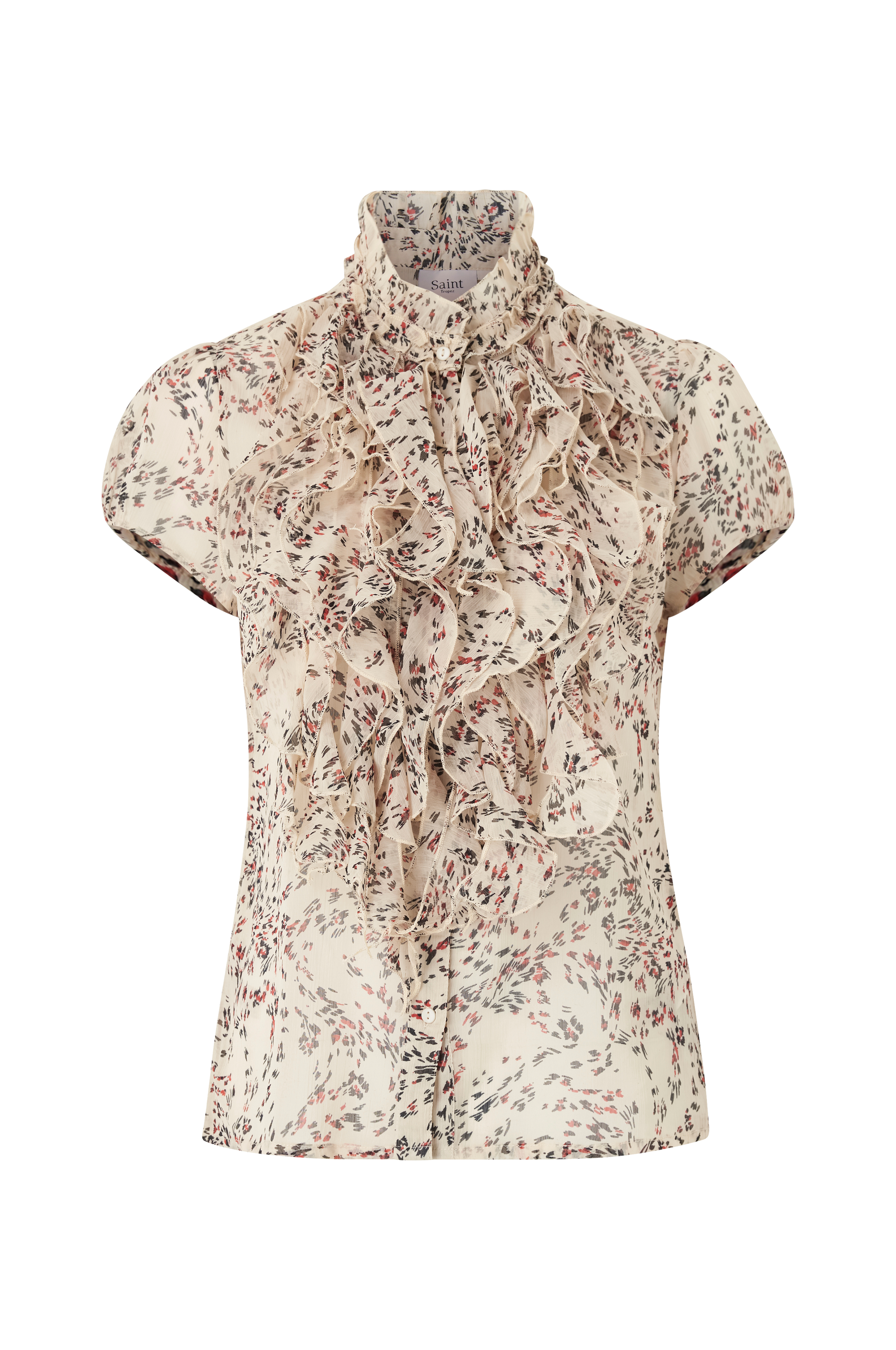 • Volant foran• Ståkrave med volant• Korte vingeærmer• Knapper foran• Fremstillet af transparent chiffon