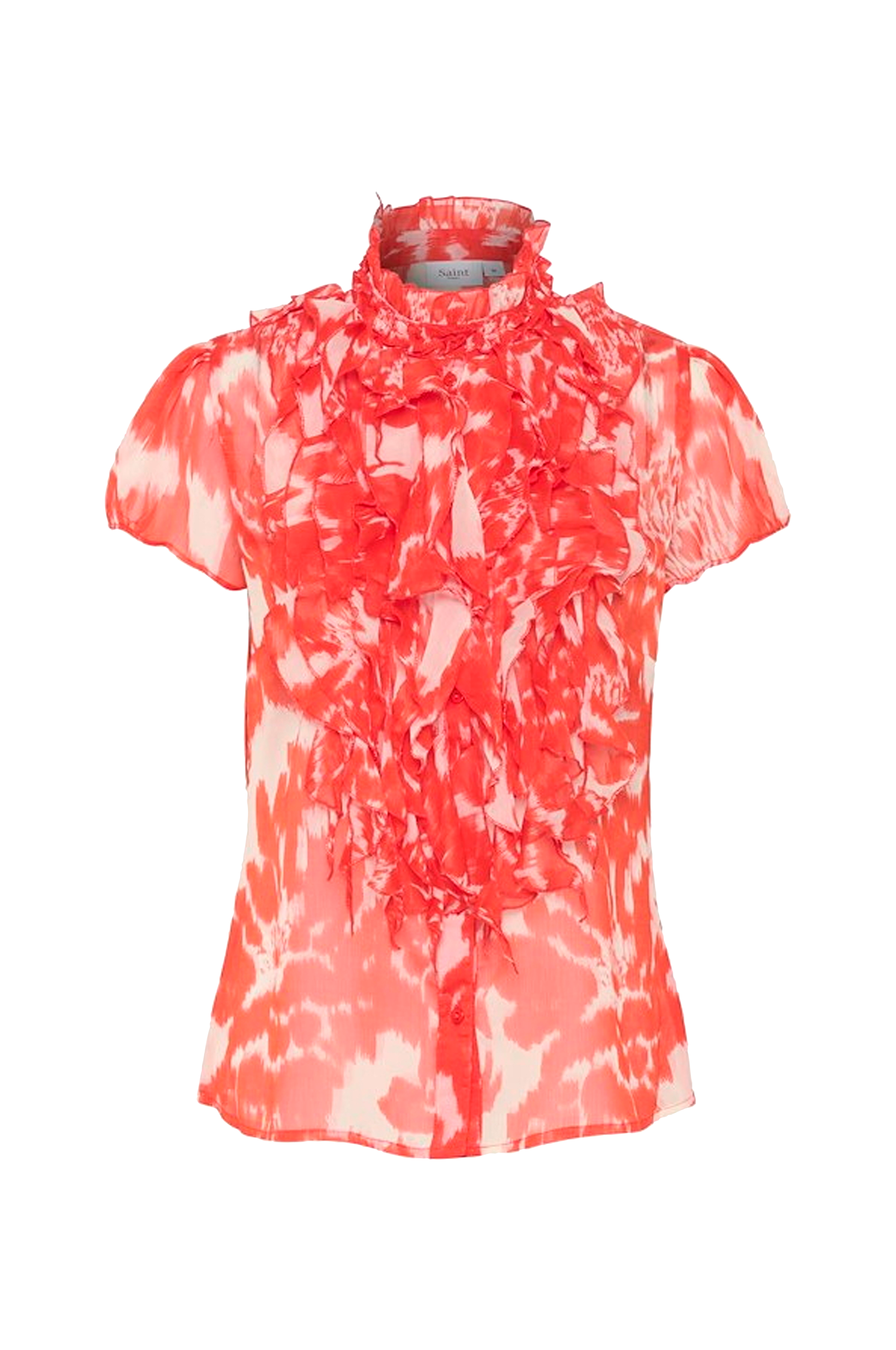 Farven (rød-hvid spættet) er virkelig lækker, og sammen med flæserne gør det blusen til en rigtig festbluse uden at se for klovneagtig ud.