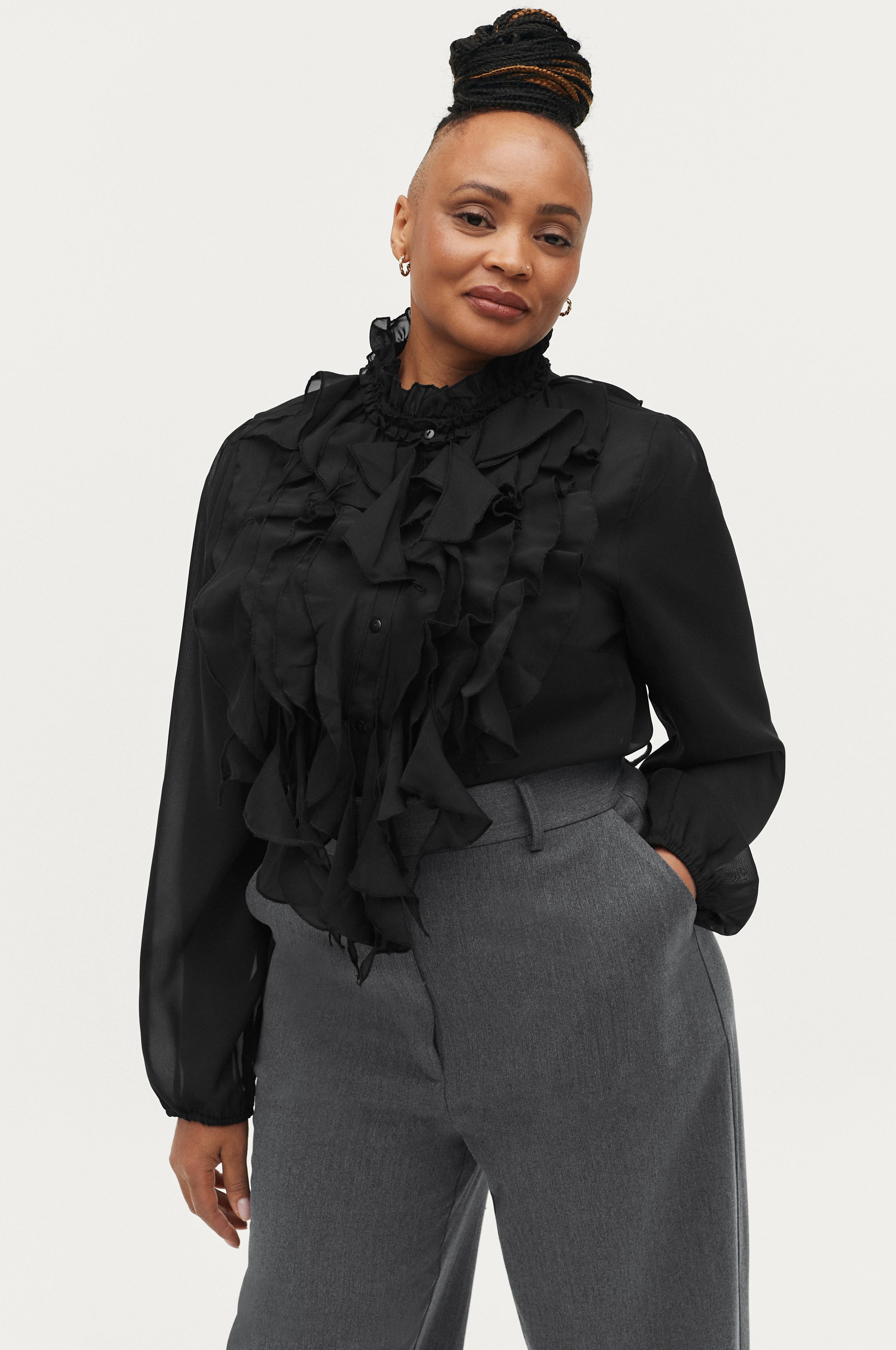 Bluse LillySZ LS Shirt fra Saint Tropez med knapper og flæser foran samt standkrave med ruchekant. 3/4-lange ærmer med elastisk ærmekant. I semitransparent chiffon.