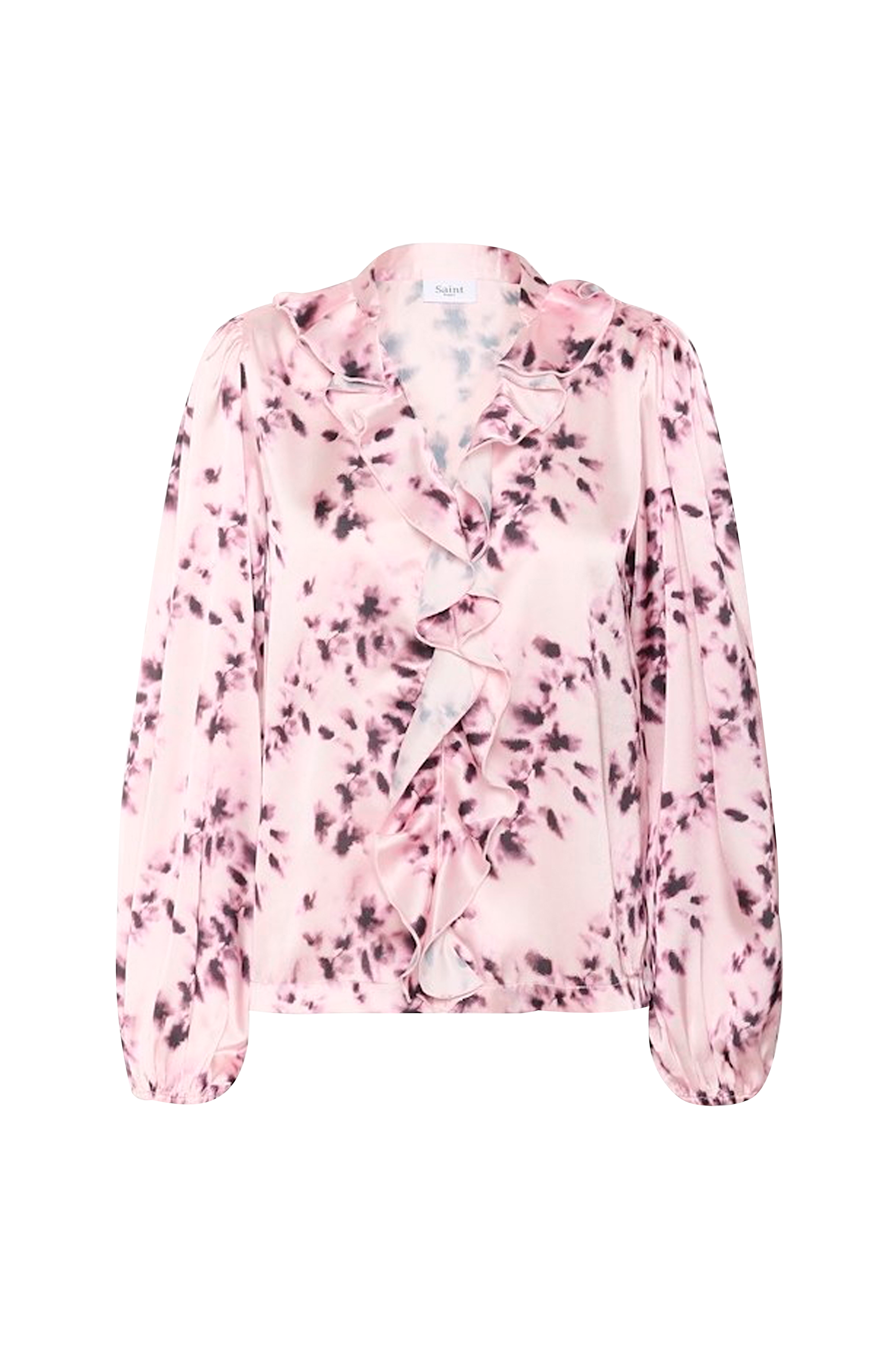 • Bluse i mønstret satin• V-formet halsudskæring med volant foran• Lange pufærmer med elastik ved manchetterne