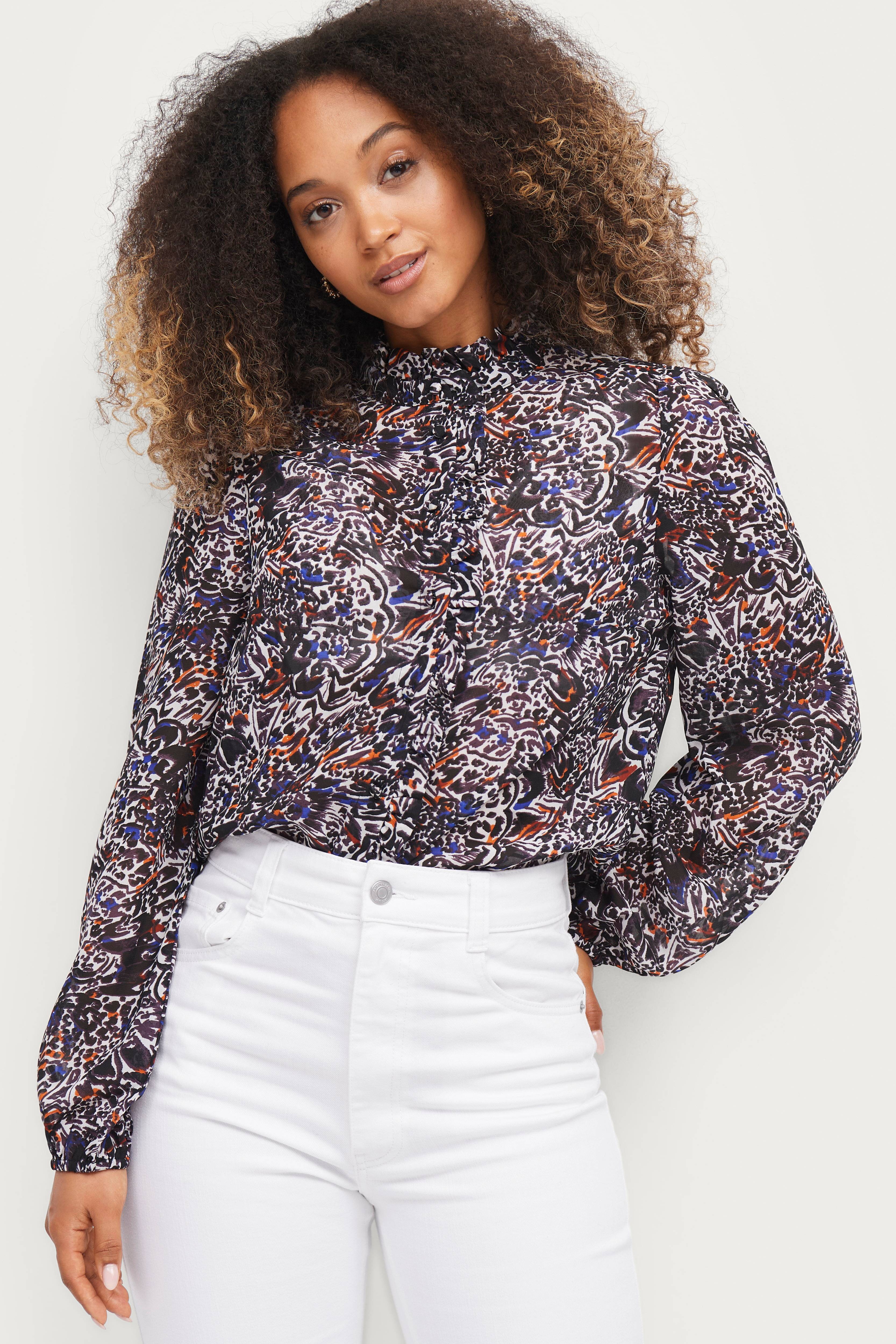 • Semitransparent materiale med printet mønster• Rund halsudskæring med flæsekant• Skjulte knapper• Volant foran• Elastisk bånd ved manchetterne