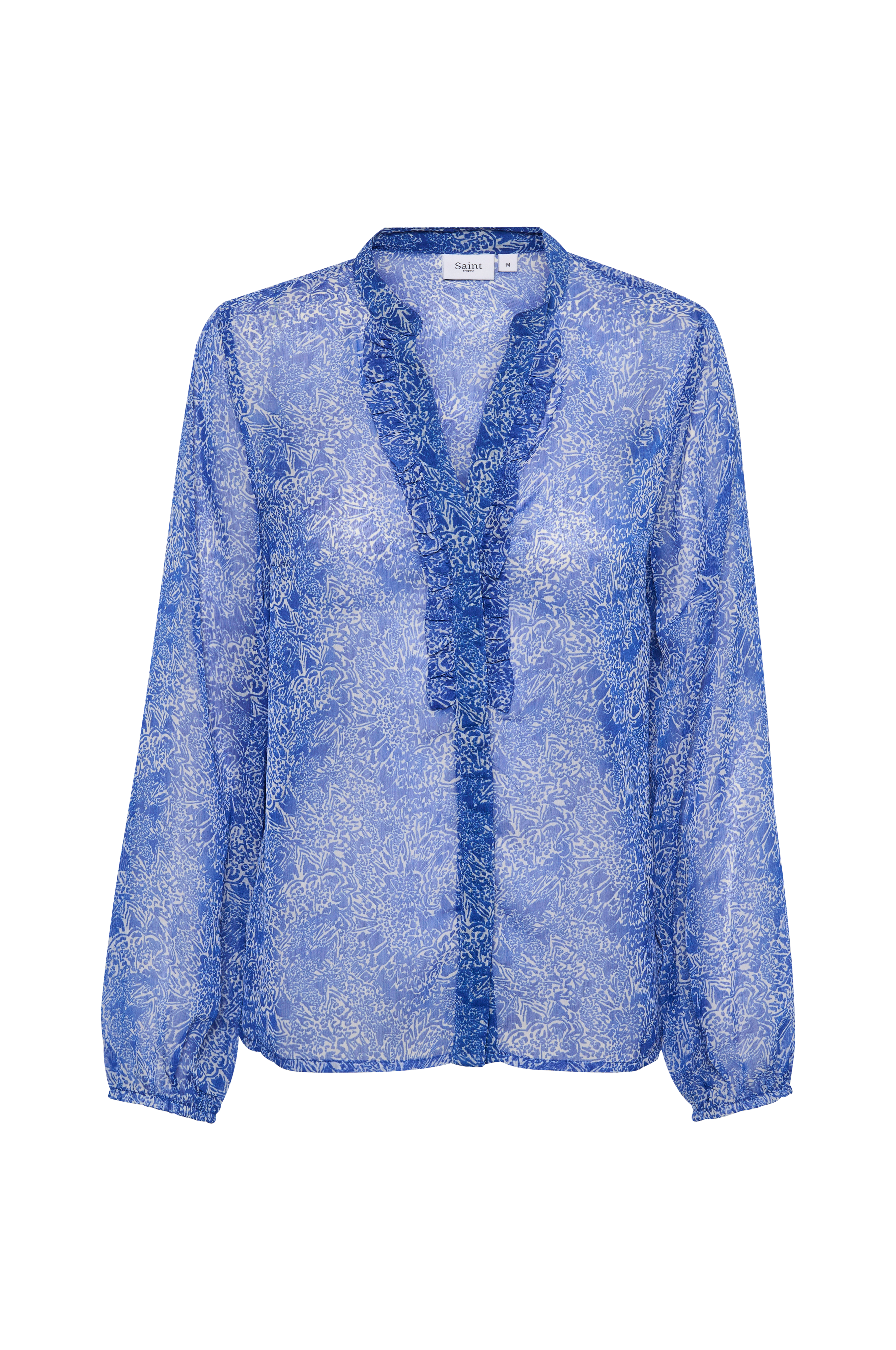 • V-udskæring• Skjulte knapper foran• Volant foran• Lange, brede ærmer med elastiske manchetter