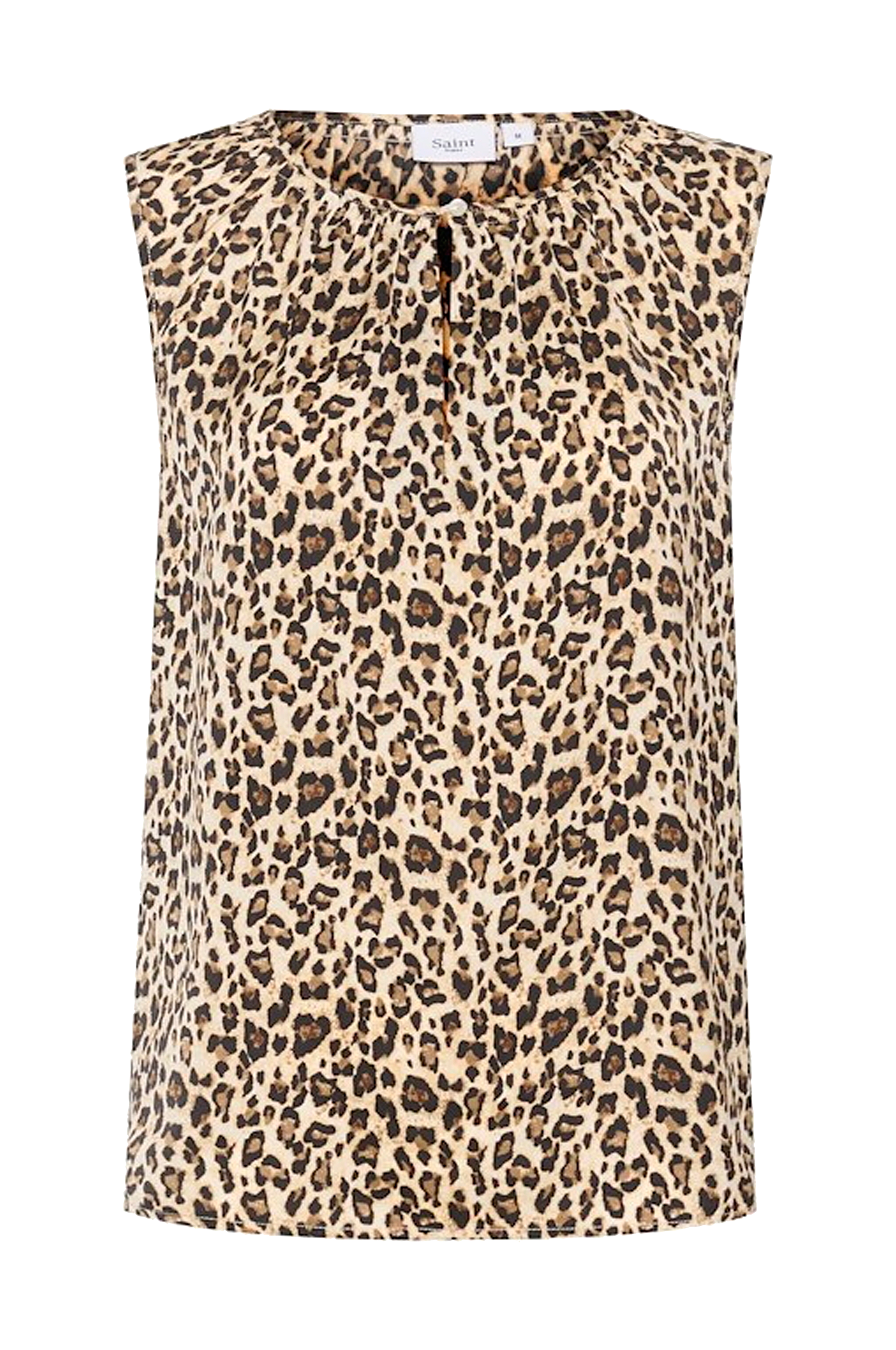 • Ærmeløs, mønstret bluse• Rund, rynket halsudskæring med ventilation og knap foran