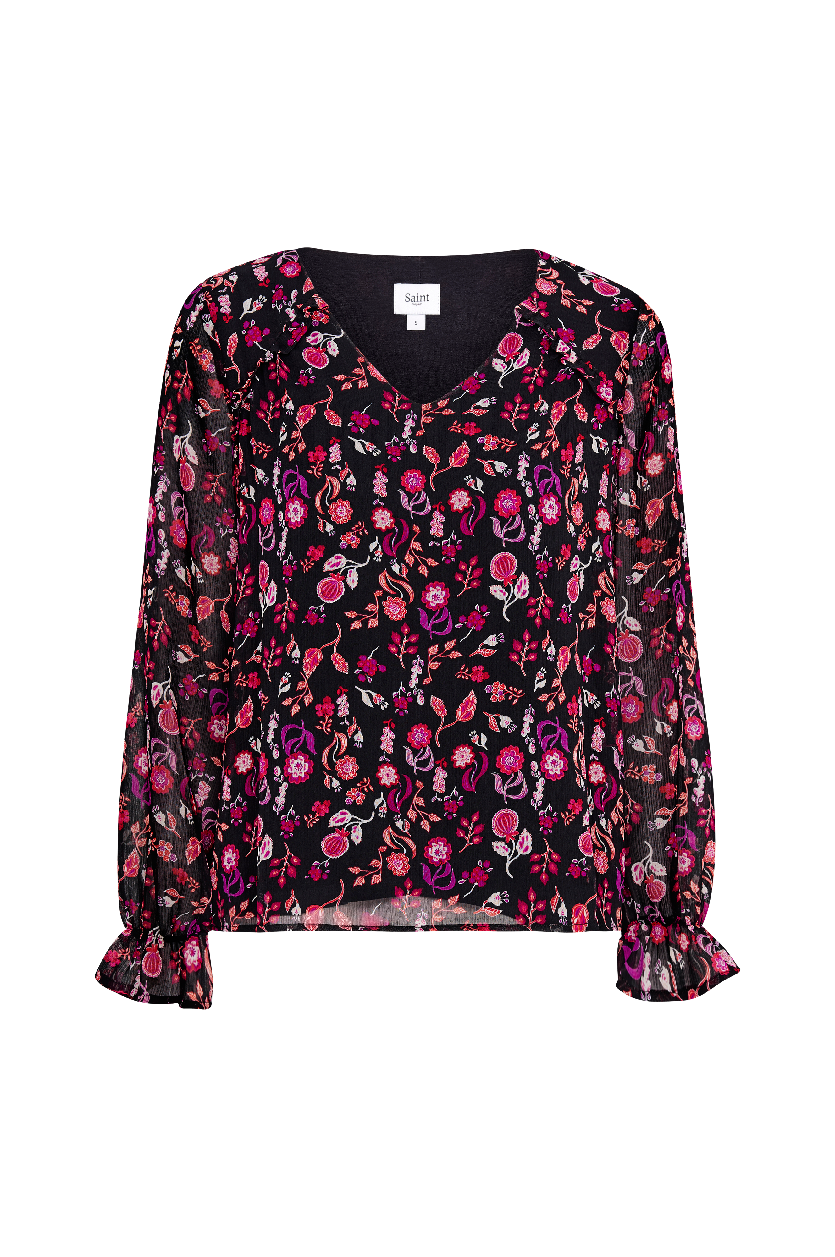 Bluse fra Saint Tropez i mønstret chiffon. Lige model med v-udskæring og små påsyede flæser foran på skuldrene samt afskåret skulderbærestykke med rynkning midt bagpå. Langt ærme med elastik forneden og flæse i ærmekant.