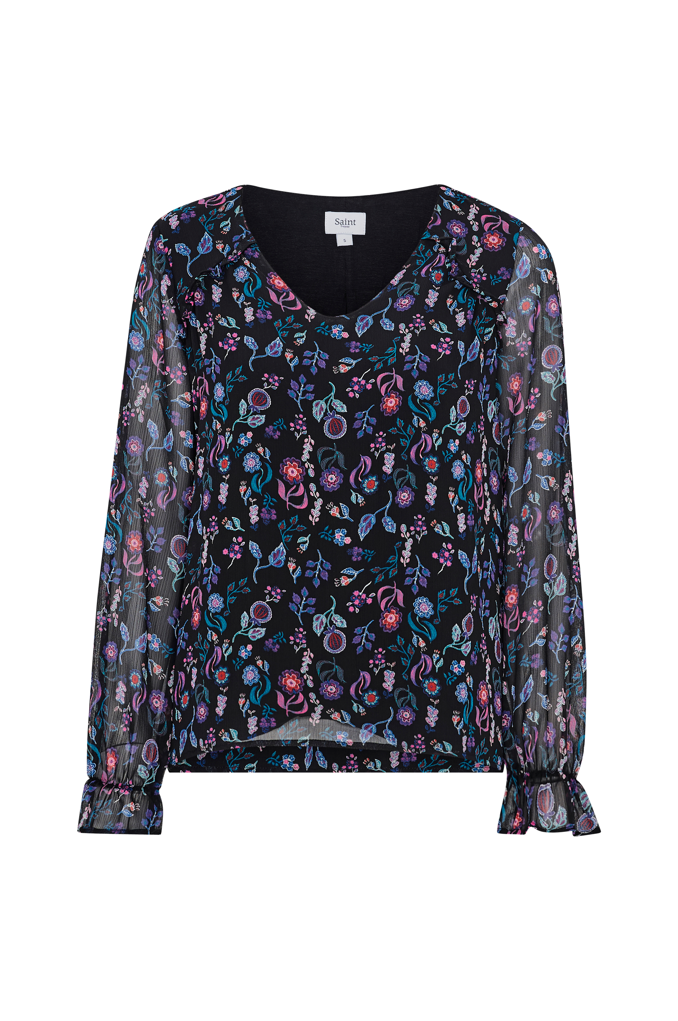 Bluse fra Saint Tropez i mønstret chiffon. Lige model med v-udskæring og små påsyede flæser foran på skuldrene samt afskåret skulderbærestykke med rynkning midt bagpå. Langt ærme med elastik forneden og flæse i ærmekant.
