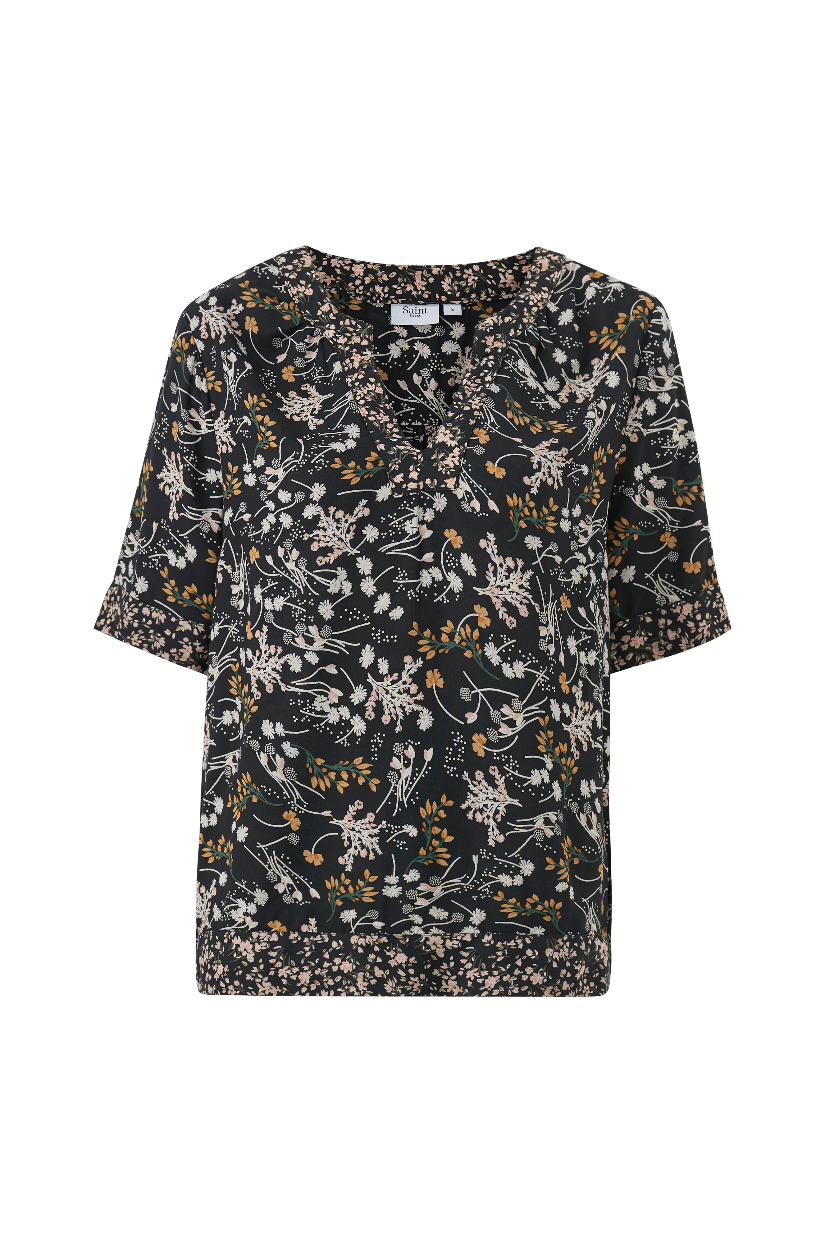 Bluse fra Saint Tropez. Lige model med indsatse i forskellige mønstre både foroven og forneden. Rund hals med påsyet kant og slids foran samt kort ærme. Vævet kvalitet med printet mønster og fint fald.