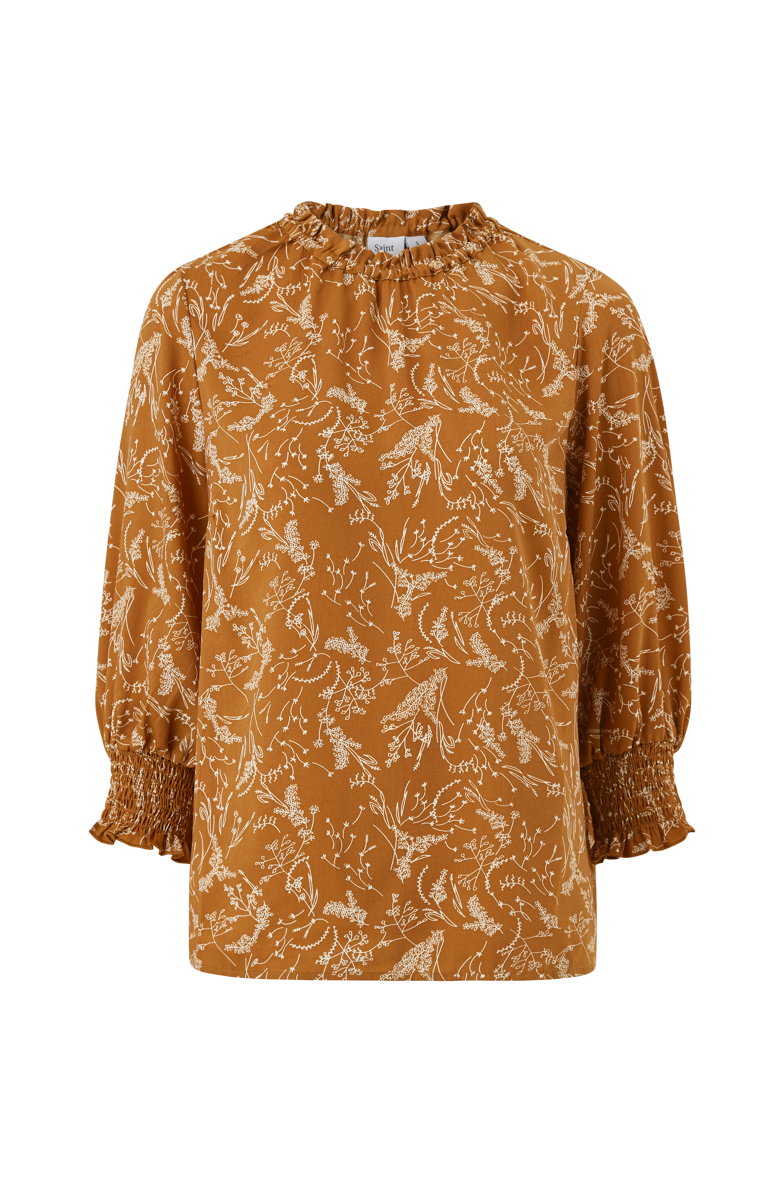 Bluse fra Saint Tropez. Lige model med rund hals som har lille flæsekant og blød, indsat elastik. Ærme i 3/4-længde med bred smockelastik i ærmekanten. Vævet satinkvalitet med printet mønster.