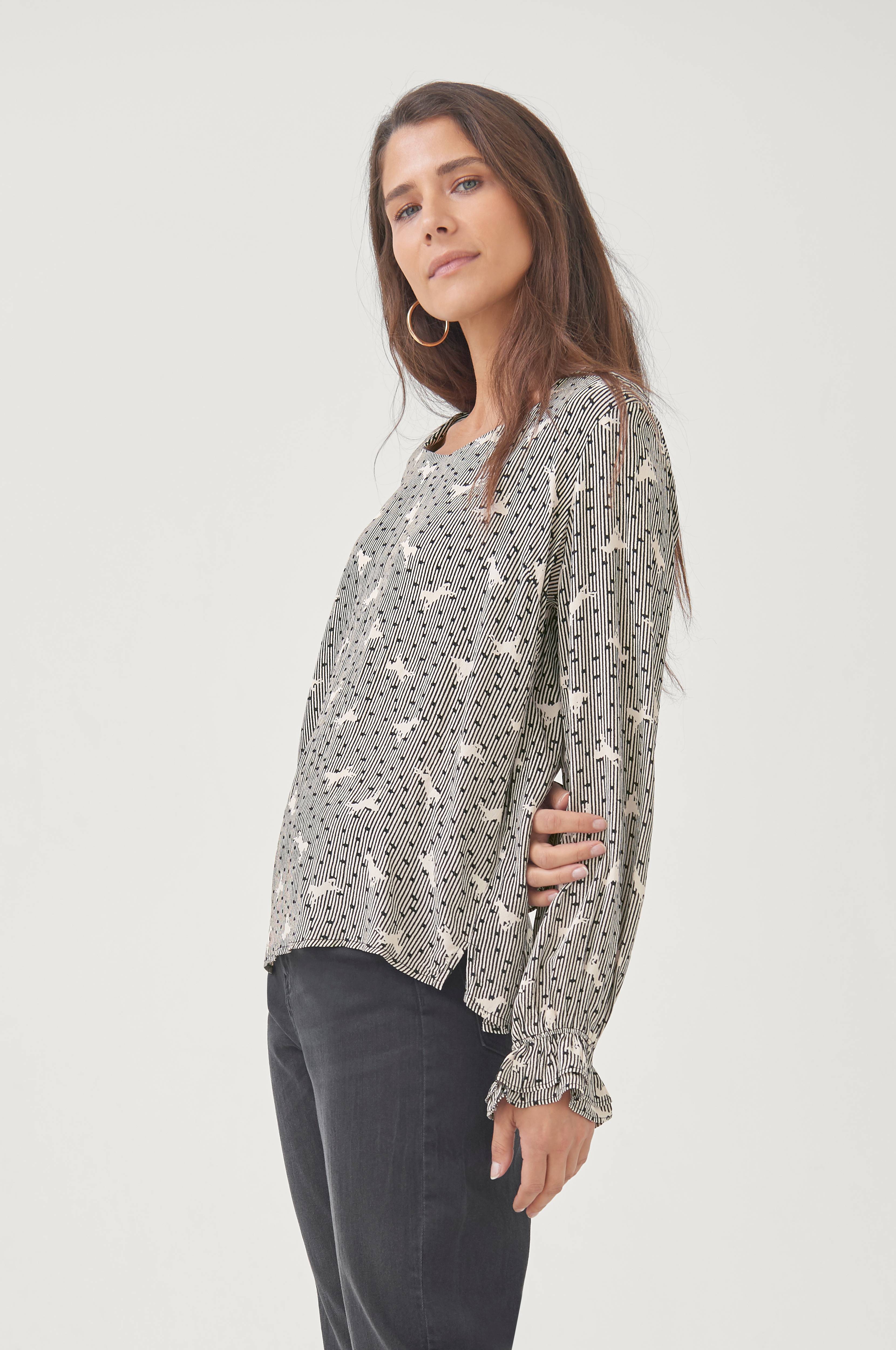 Top fra Saint Tropez. Lige model med løst snit og dekorativt kantskåret halsudskæring. Ekstra langt ærme med indsat elastik forneden og dobbelte flæser i ærmekant. Vævet crepekvalitet.