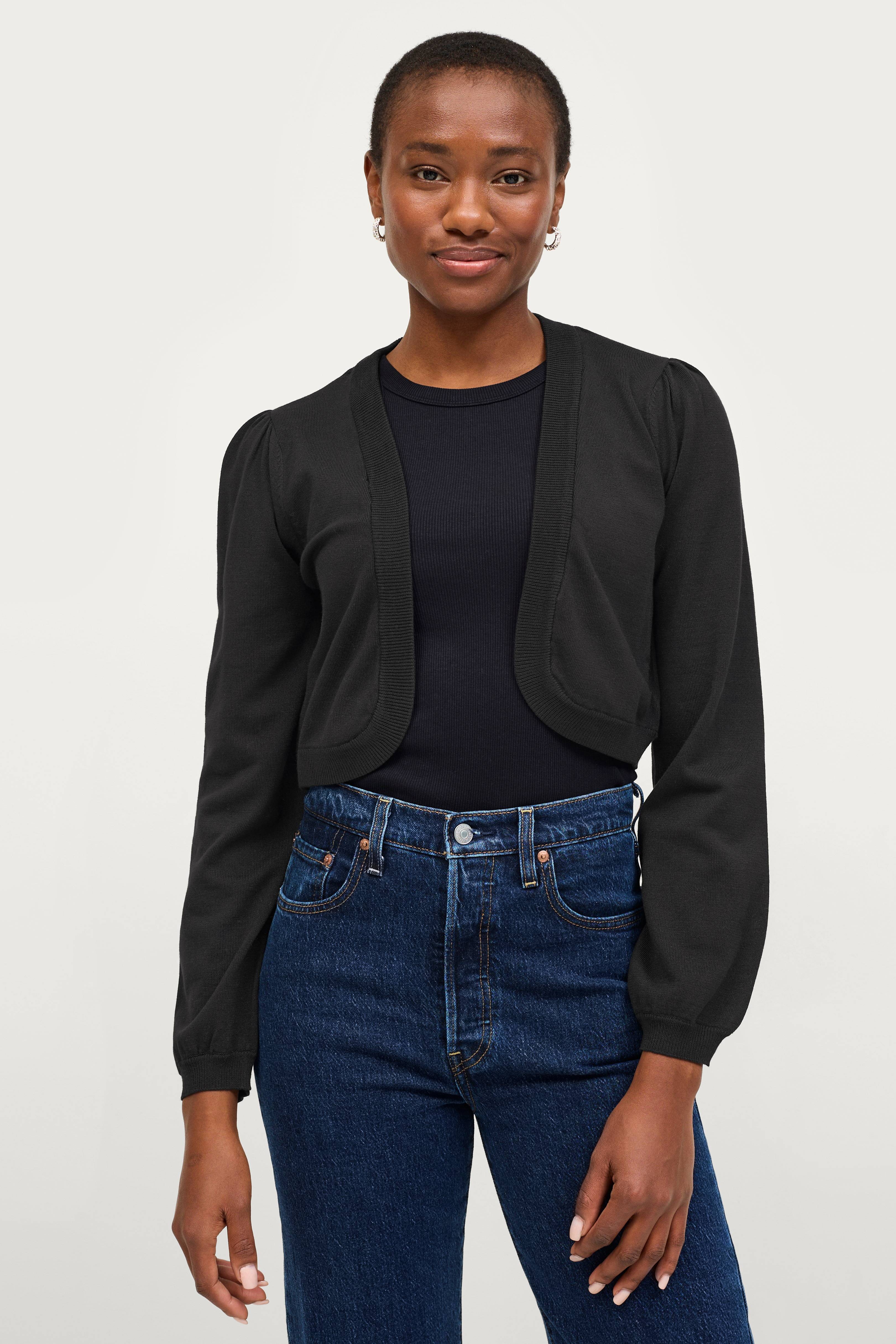 • Kort cardigan• Tynd, fintstrikket kvalitet• Ingen knapper• Samling på skuldrene