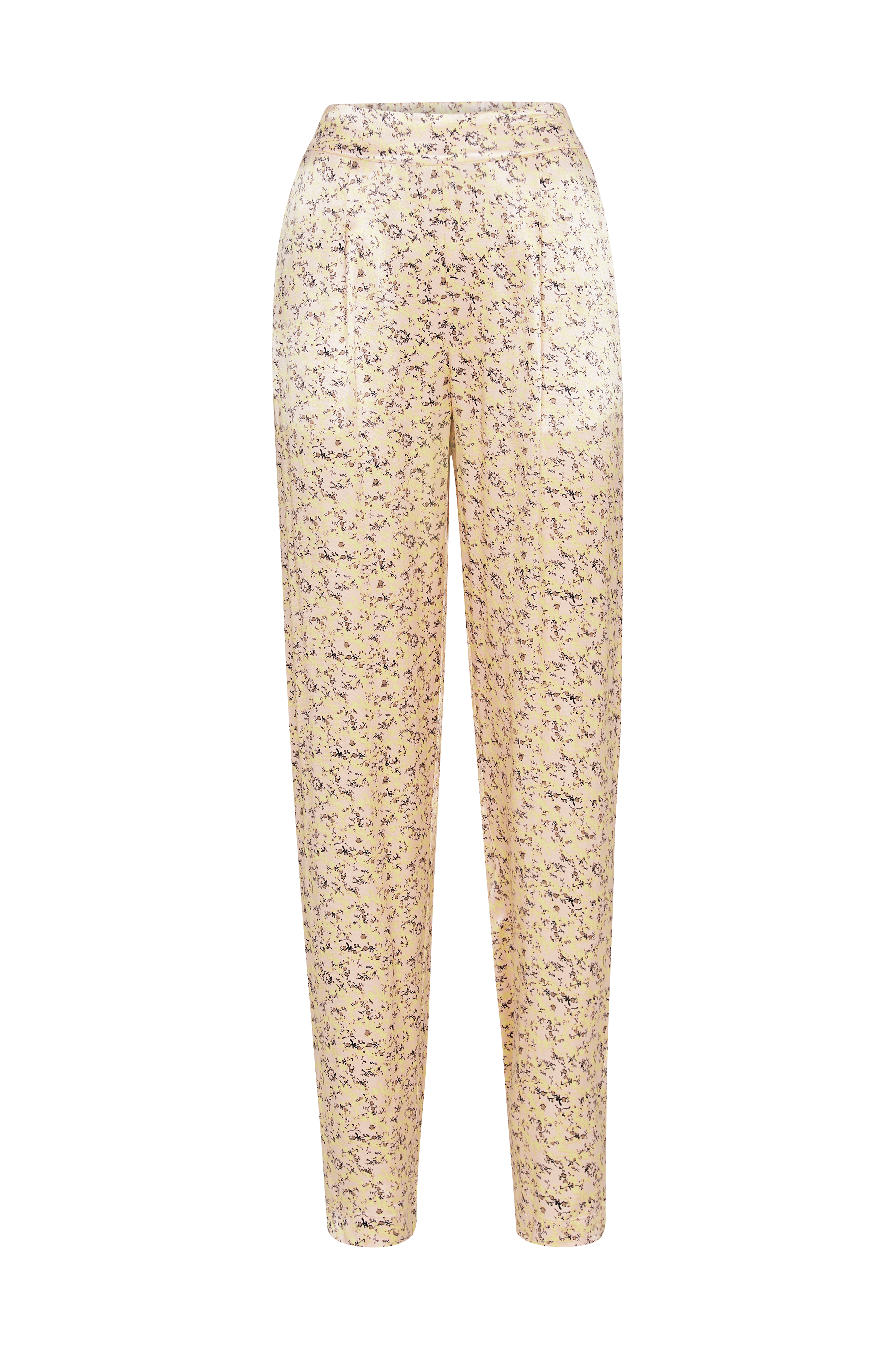 Buks fra Saint Tropez. Flot model med vide ben og let bukseben, der bliver smallere nedefter med lille slids på ydersiden af benkanten. Påsyet linning med nedsyede læg foran og indsat elastik bagpå. To stiklommer foran og to indsatte snydelommer bagpå. Vævet satinkvalitet med blødt fald og printet mønster. Benlængde ca. 82 cm i str. M. Fodvidde ca. 36 cm.