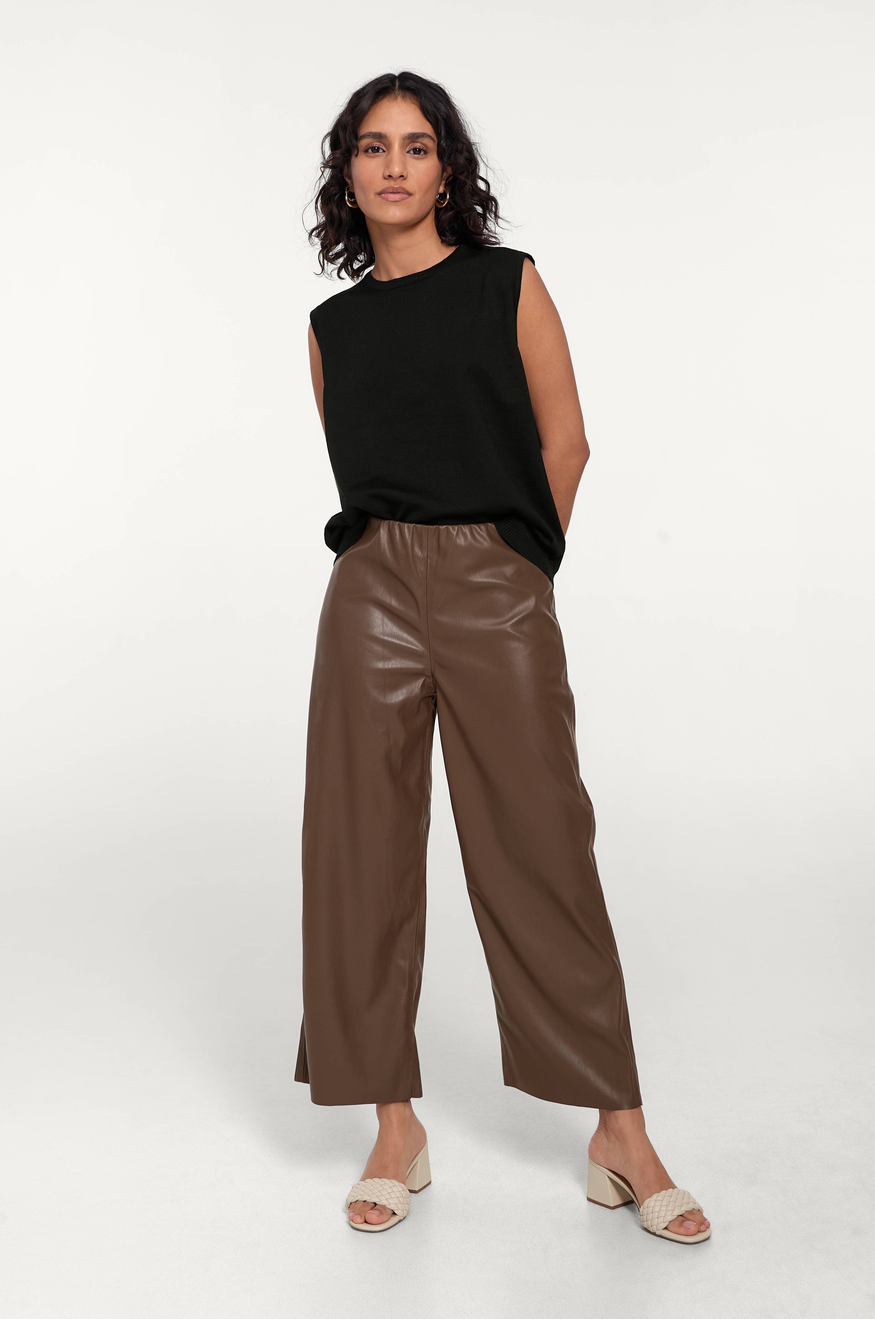 Vide, ankellange bukser i imiteret skind med stretch. Skjult elastik i taljen og usømmede benkanter. Benlængde ca. 64 cm i str. S.