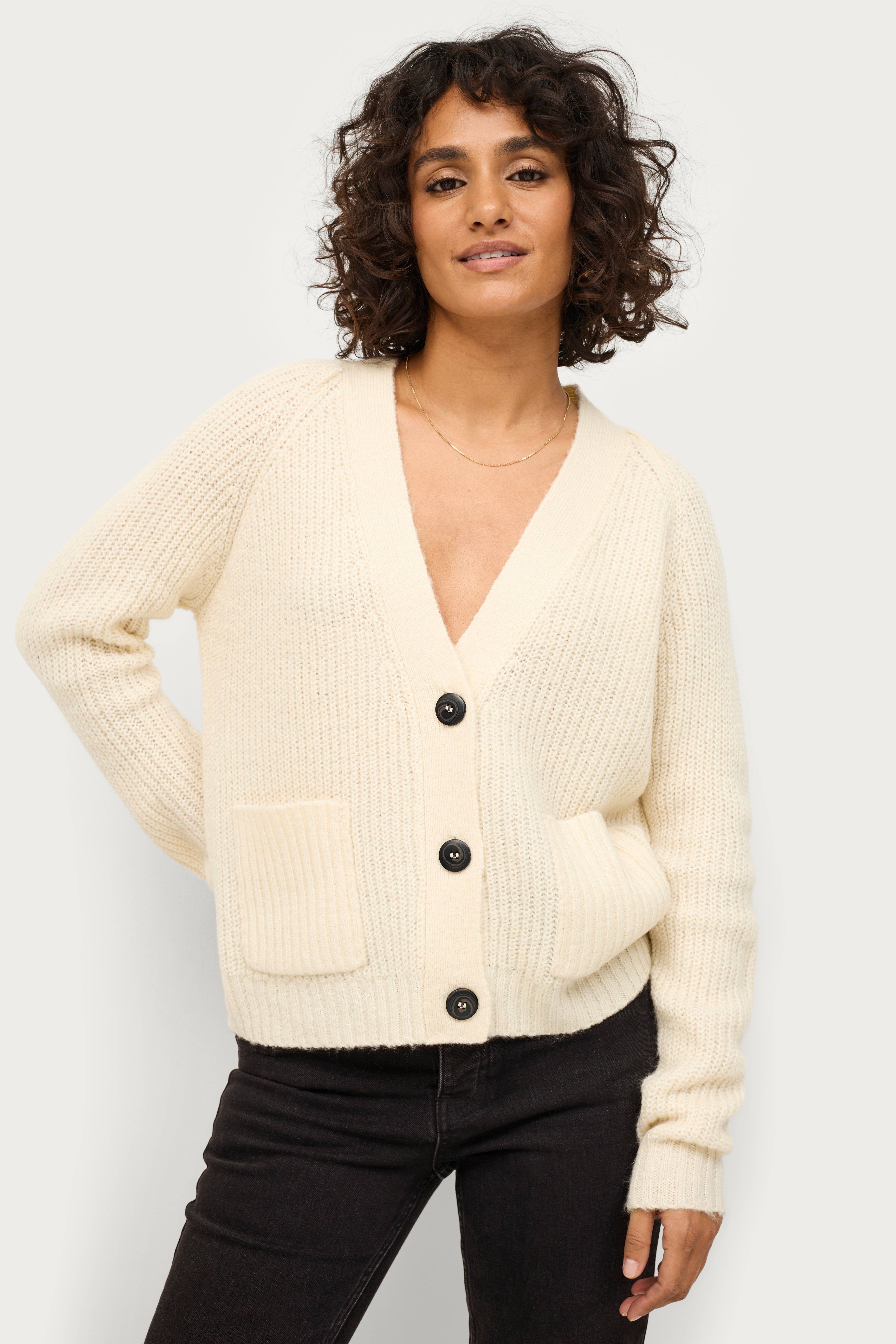 • Ribstrikket model• Dyb v-udskæring• Store knapper foran• To lommer