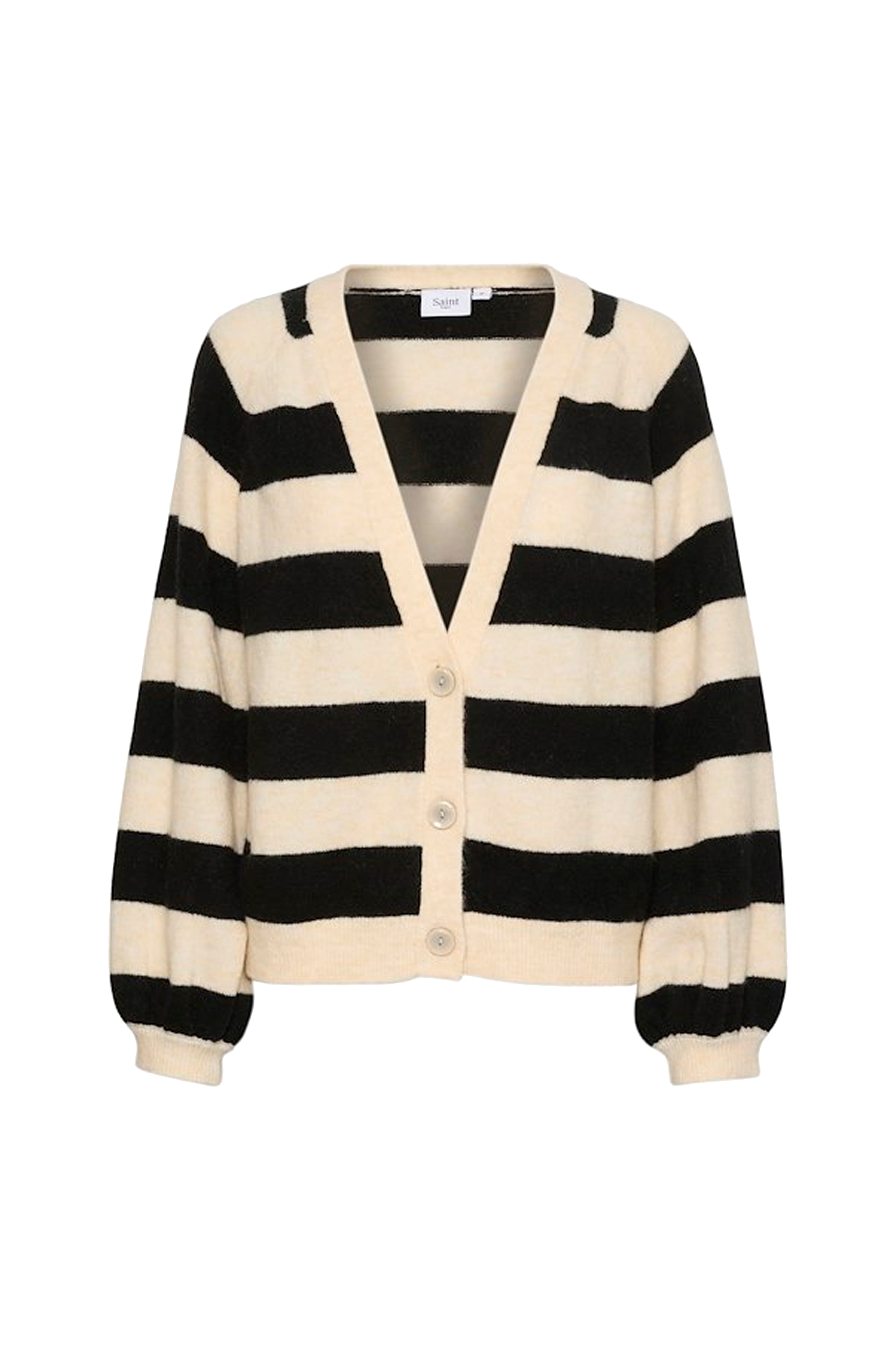• Model med strikkede striber• Dyb v-udskæring• Tre knapper• Ribstrik ved manchetterne og nederst