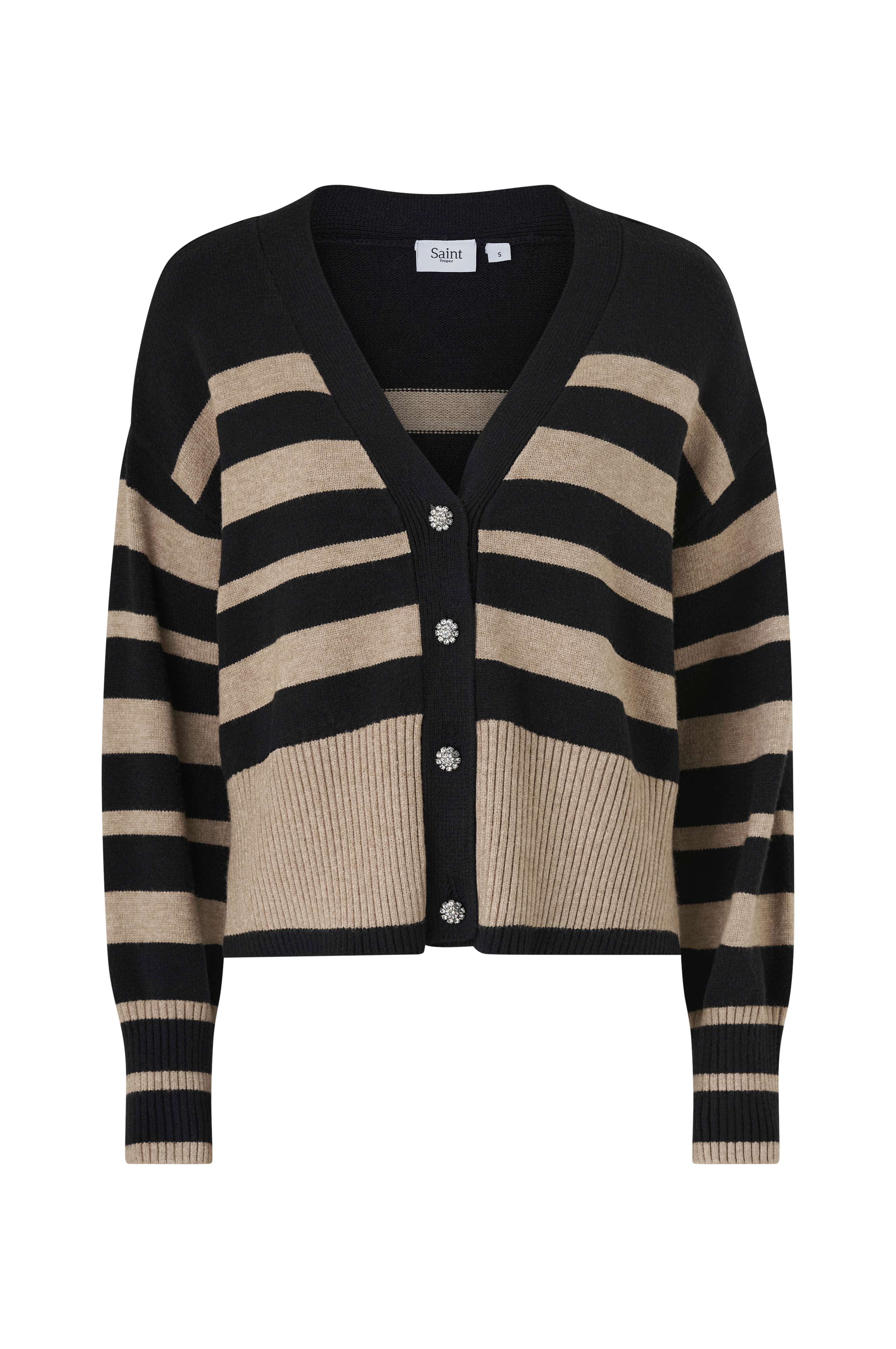 • Fintstrikket cardigan i bomuldsblanding med stribet mønster• Lange arme med nedsænket skulder• Halsudskæring• Knapstolpe foran med dekorative, glitrende knapper• Ribstrik ved manchetterne og nederst• Korte slidser i siderne