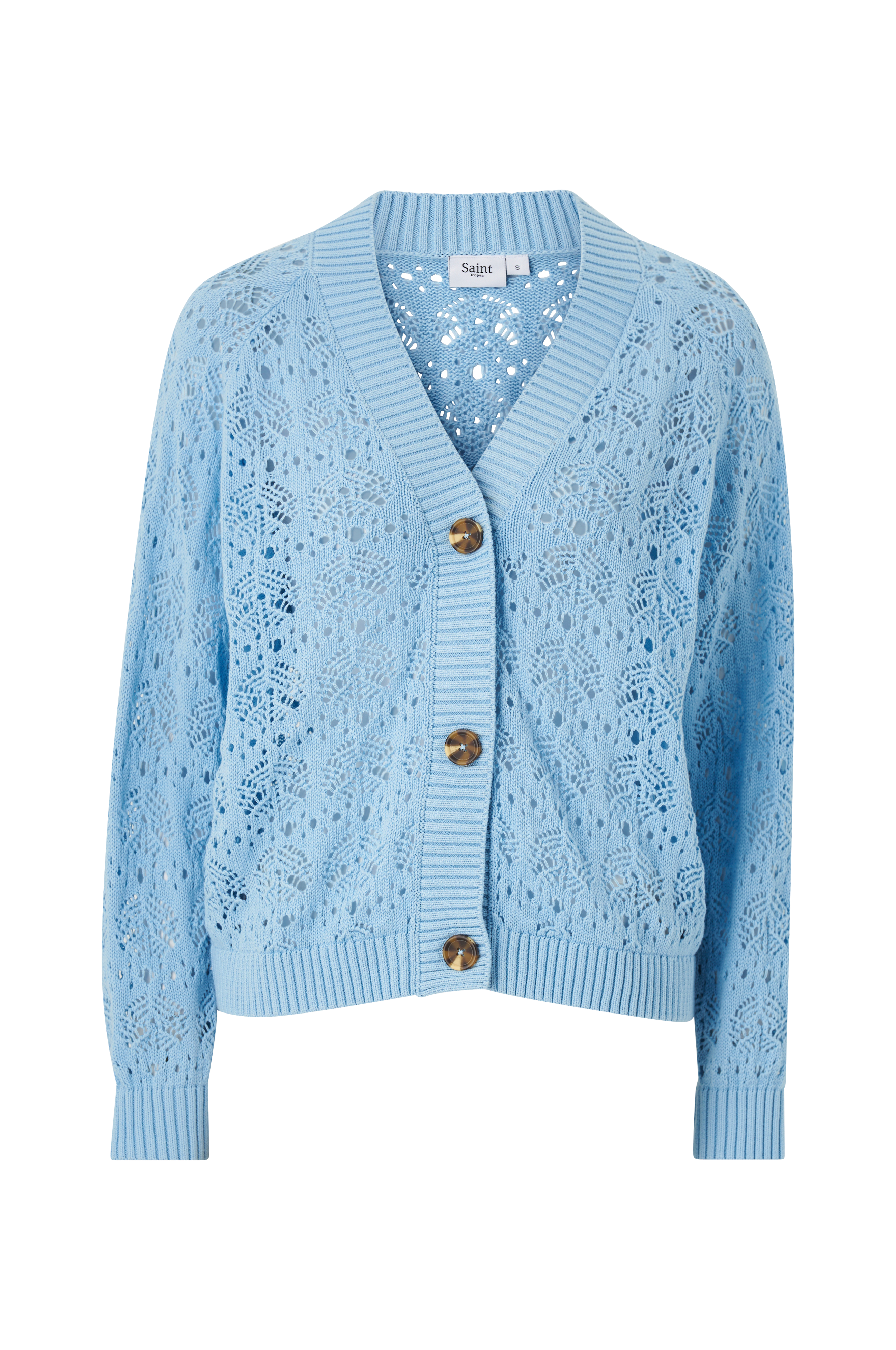 • Strikket cardigan med hulmønster• V-formet halsudskæring• Knaplukning• Ribstrik ved fronten, ved ærmeafslutningerne og nederst