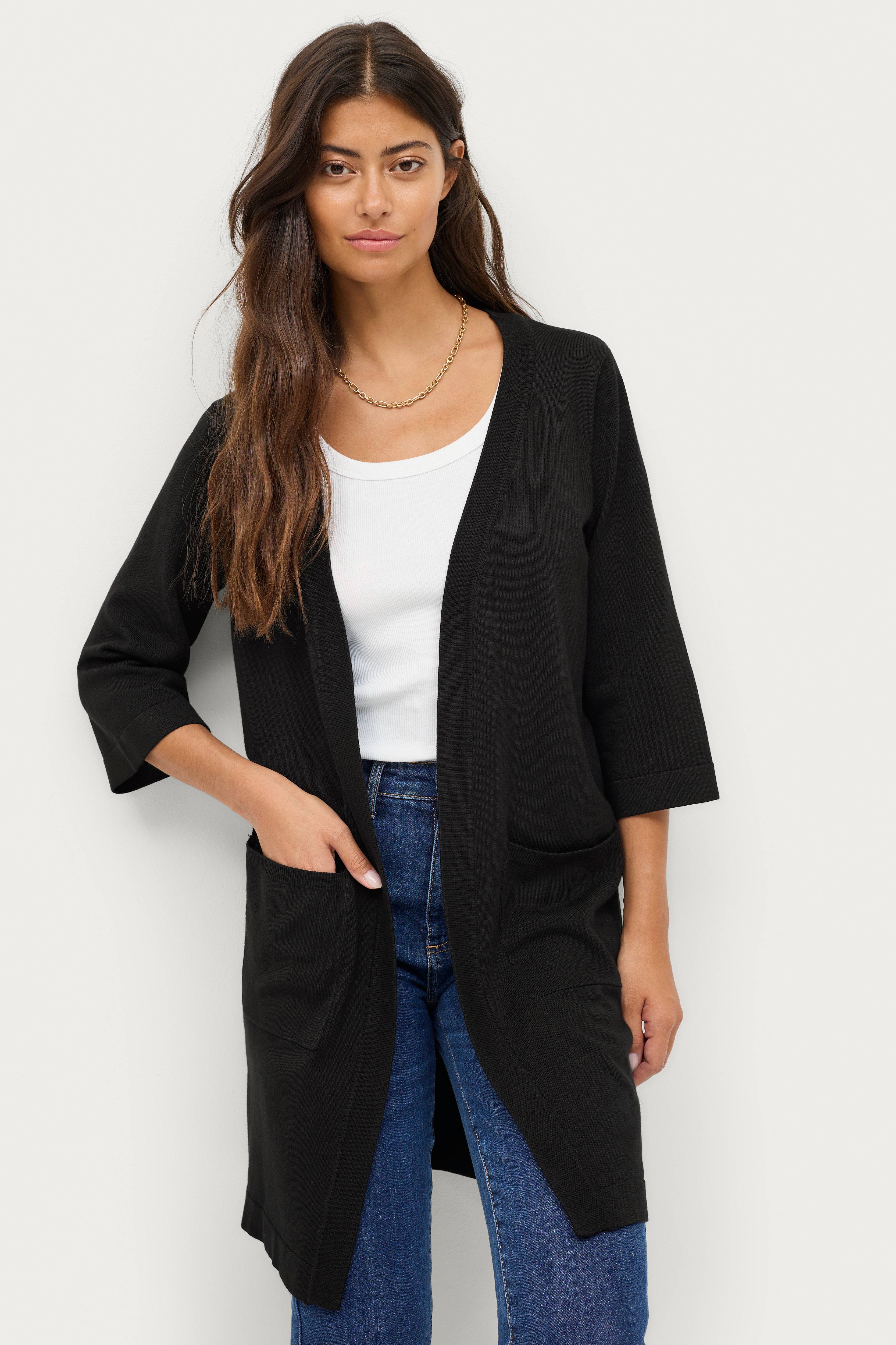 • Strikket, lang cardigan• Åben model• Halvlange ærmer• To lommer