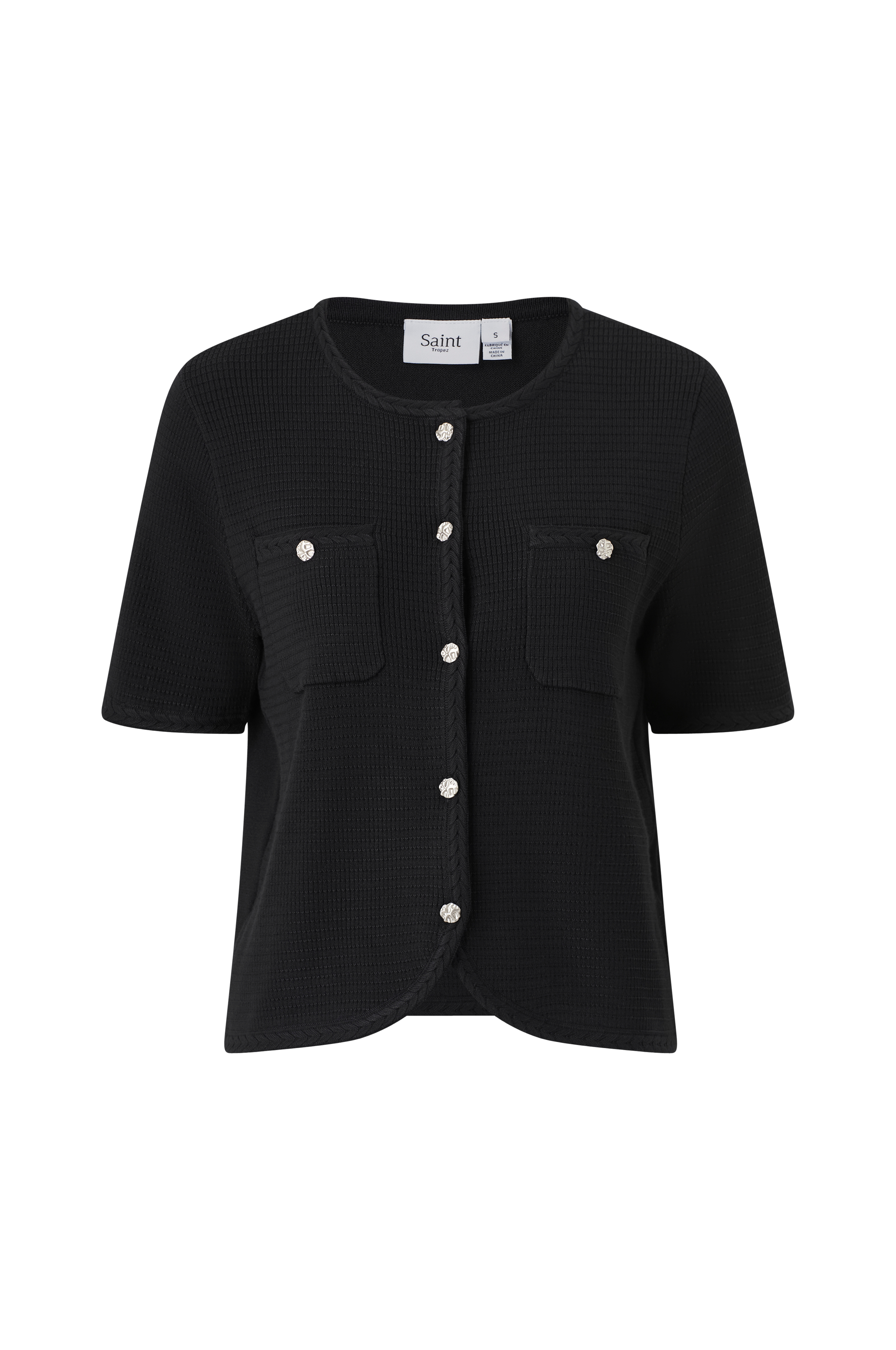 • Kortærmet, strukturstrikket cardigan med rund halsudskæring• Brystlommer med påsyede, dekorative knapper• Sølvfarvede, dekorative knapper foran