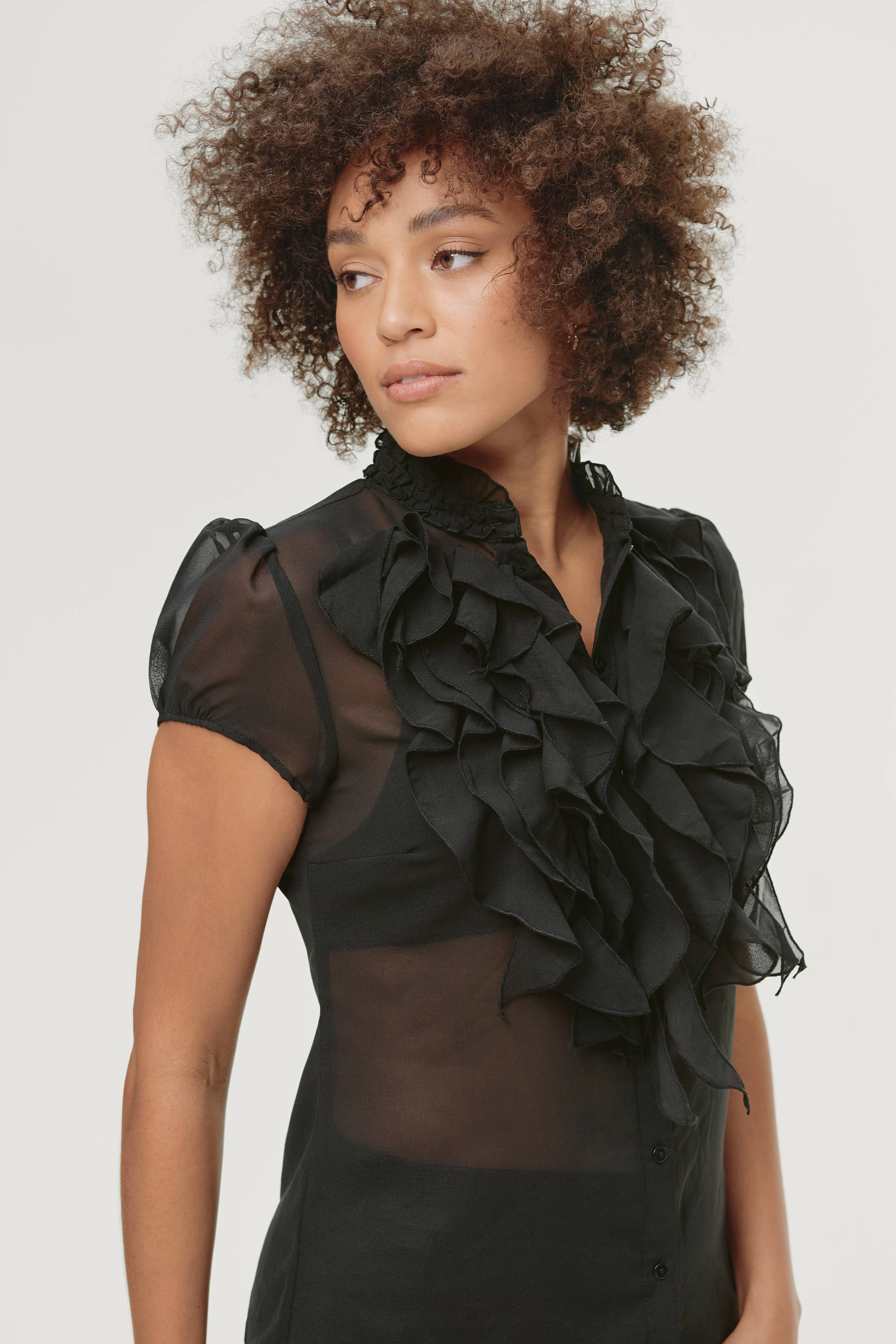 Flæsebluse LillySZ SS Shirt fra Saint Tropez. Noget figursyet model med flæse i hals og flere påsyede flæser på brystet. Kort ærme med lille, indsat elastik på oversiden. Chiffonkvalitet.