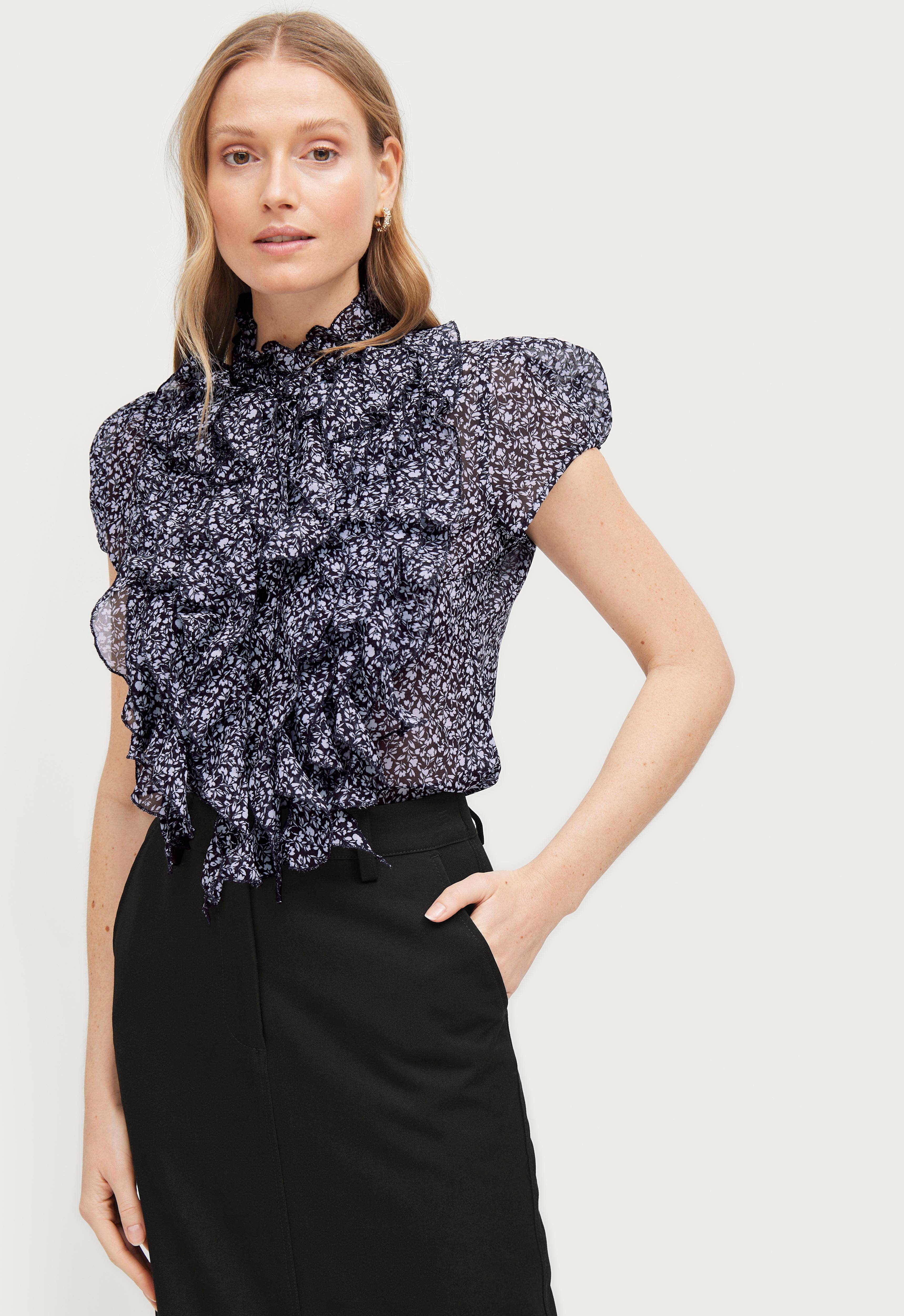 Flæsebluse LillySZ SS Shirt fra Saint Tropez. Noget figursyet model med flæse i hals og flere påsyede flæser på brystet. Kort ærme med lille, indsat elastik på oversiden. Chiffonkvalitet.