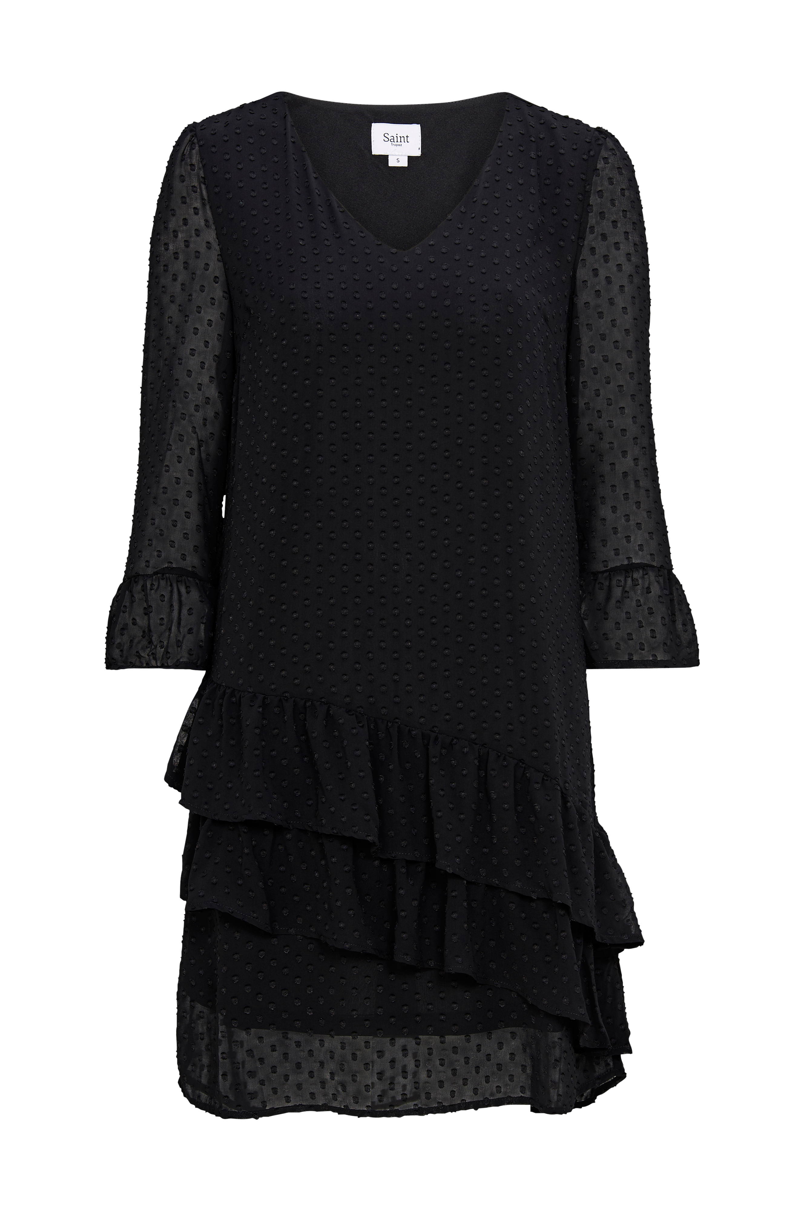 Flæsekjole fra Saint Tropez. A-formet model med diagonale flæser forneden samt lige, 3/4-langt ærme med puf ved skulderen og flæse i ærmekanten. Chiffon med vævede strukturprikker og blødt for i jersey. Længde ca. 95 cm i str. S.