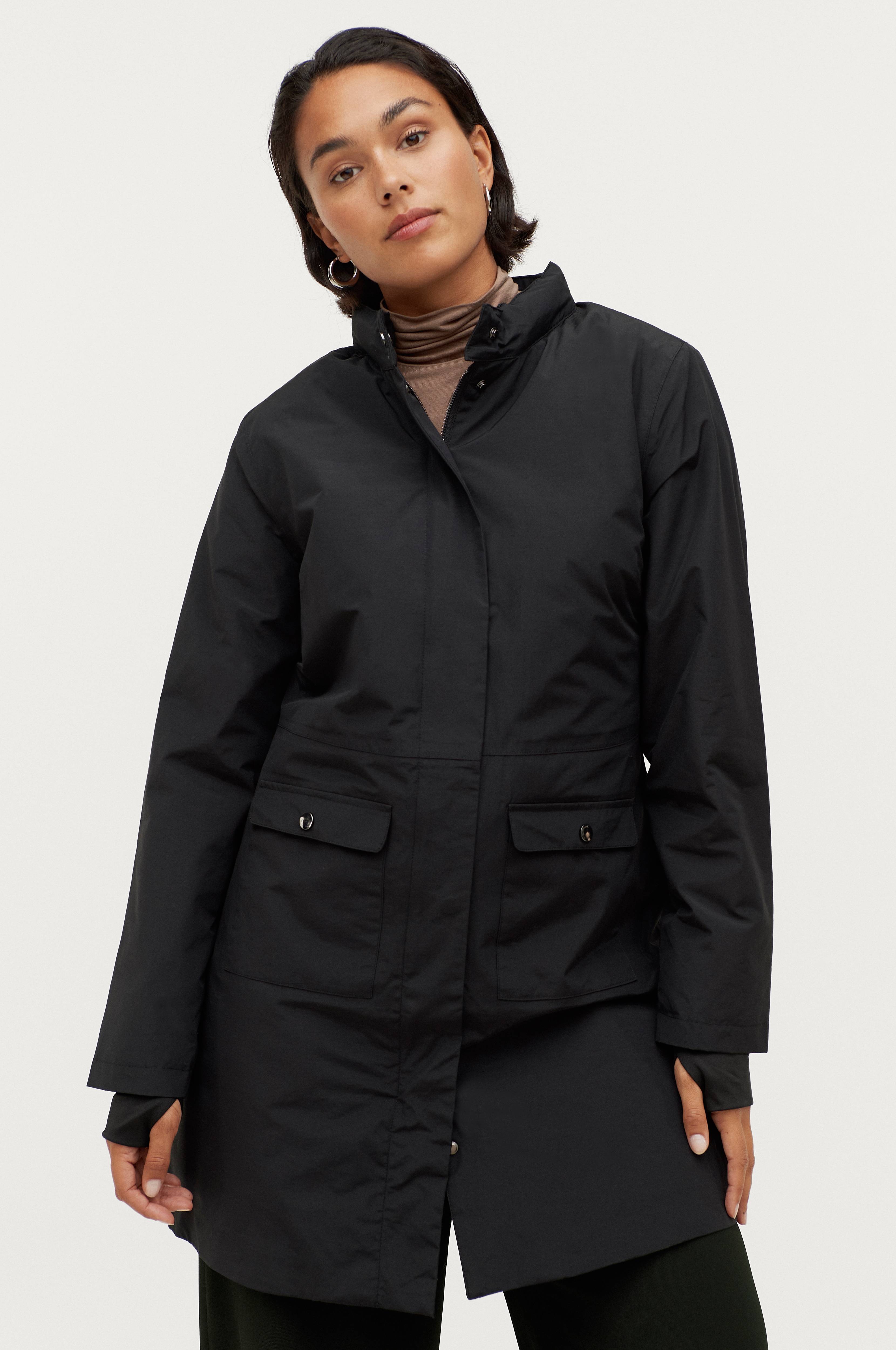 Stilren, vandtæt funktionsjakke i parkacoatmodel med tynd vattering og åndbarhed. Vandsøjletryk 5.000 mm og tapede sømme. 2-vejslynlås med overfald og trykknapper foran. Standkrave med gemt hætte. Ribkant i jersey og justerbar tamp i ærmekant. Slids i kanten forneden bagpå. Længde ca. 89 cm i str. S.