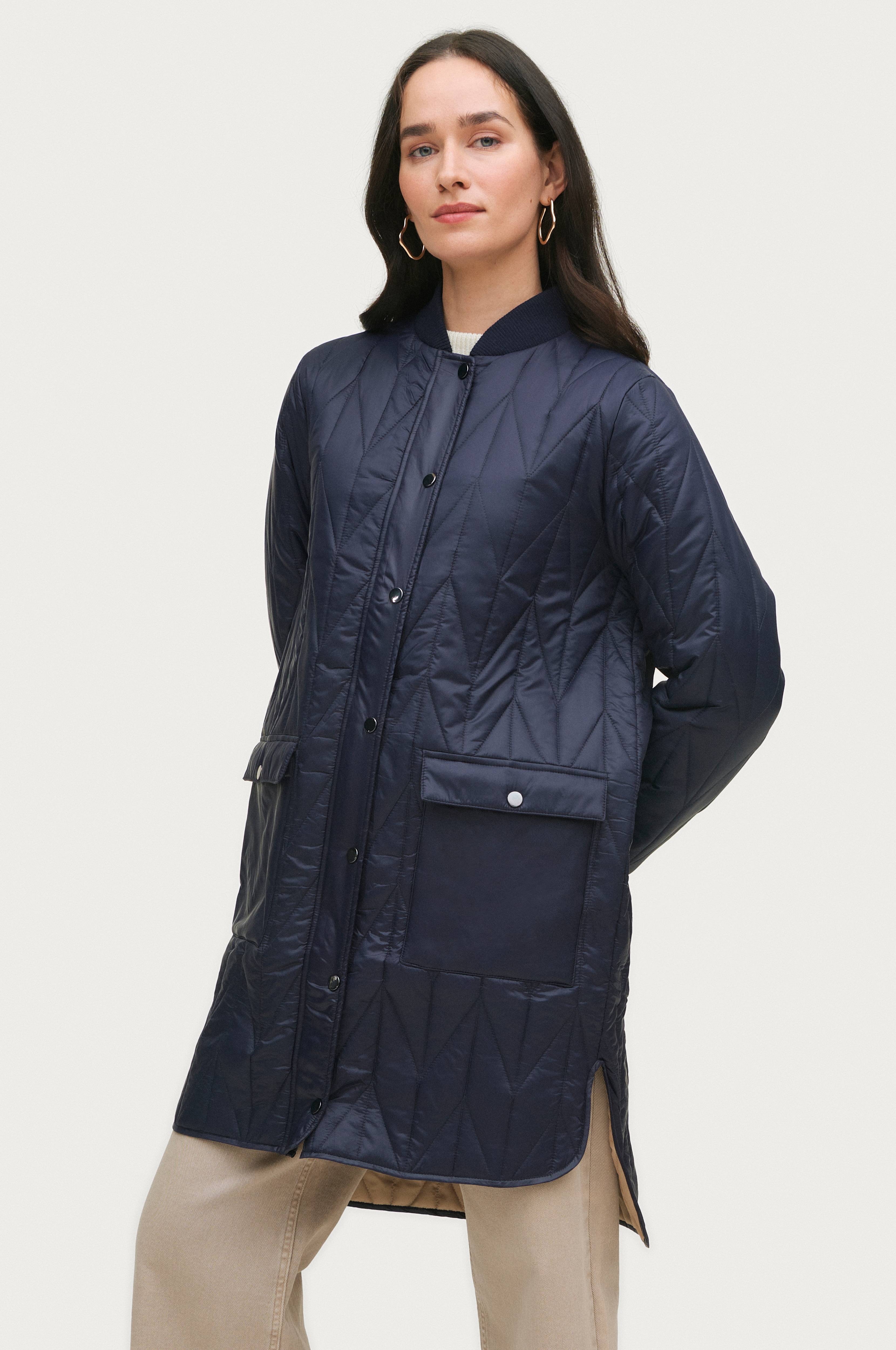 • Quiltet model med tynd polstring• To-vejs lynlås med vindflap og trykknapper• Ribmanchet ved manchetterne og i halsen• To lommer foran• Ventilation nede i siderne• Lidt længere bagtil• Længde: 98 cm i størrelse S