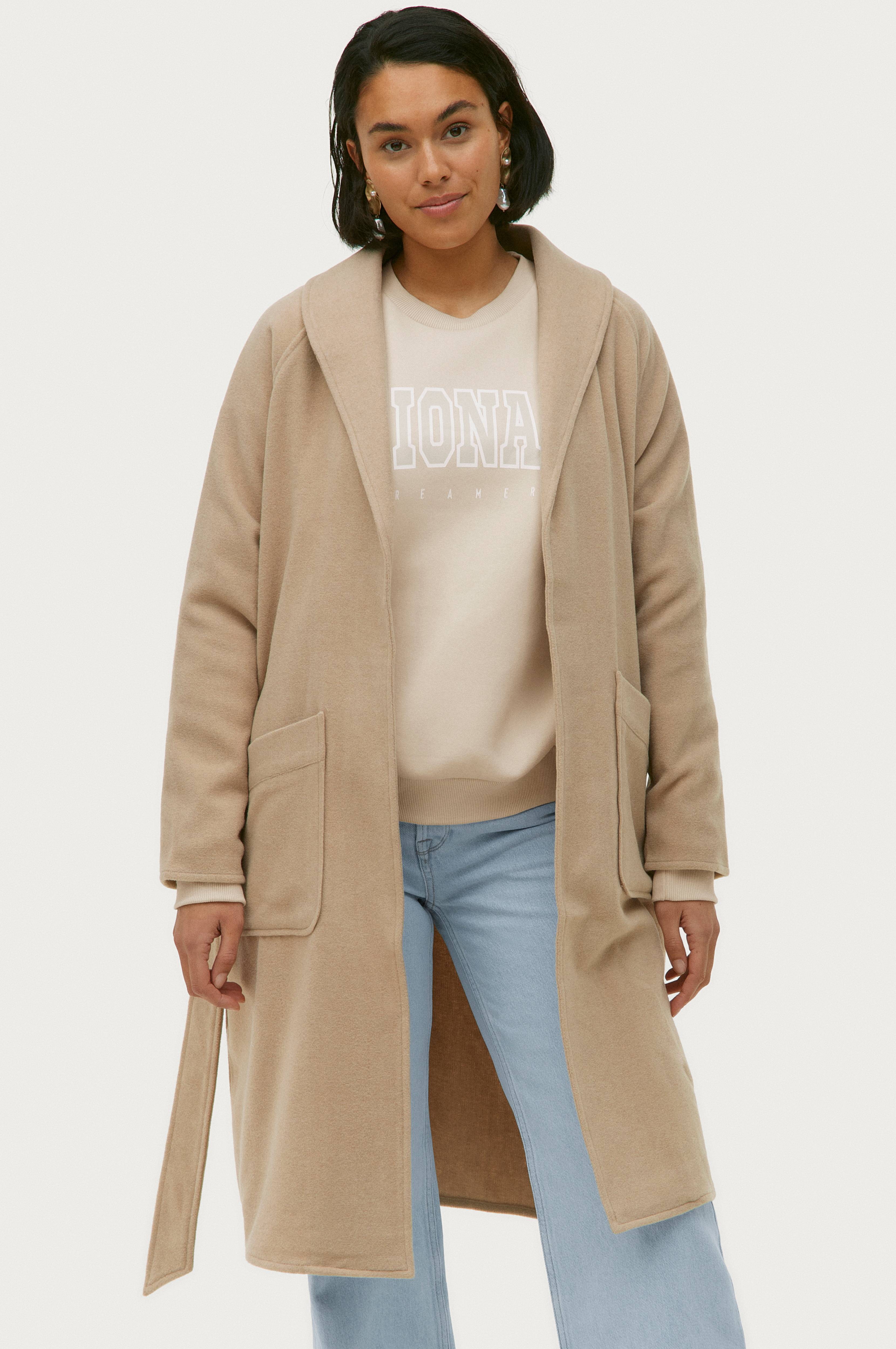 • Åben model med bæltespænde ved taljen• Påsyede lommer• Raglanærmer• Sjalskrage• Blød, filtet kvalitet• Uforet• Længde: 103 cm i størrelse S