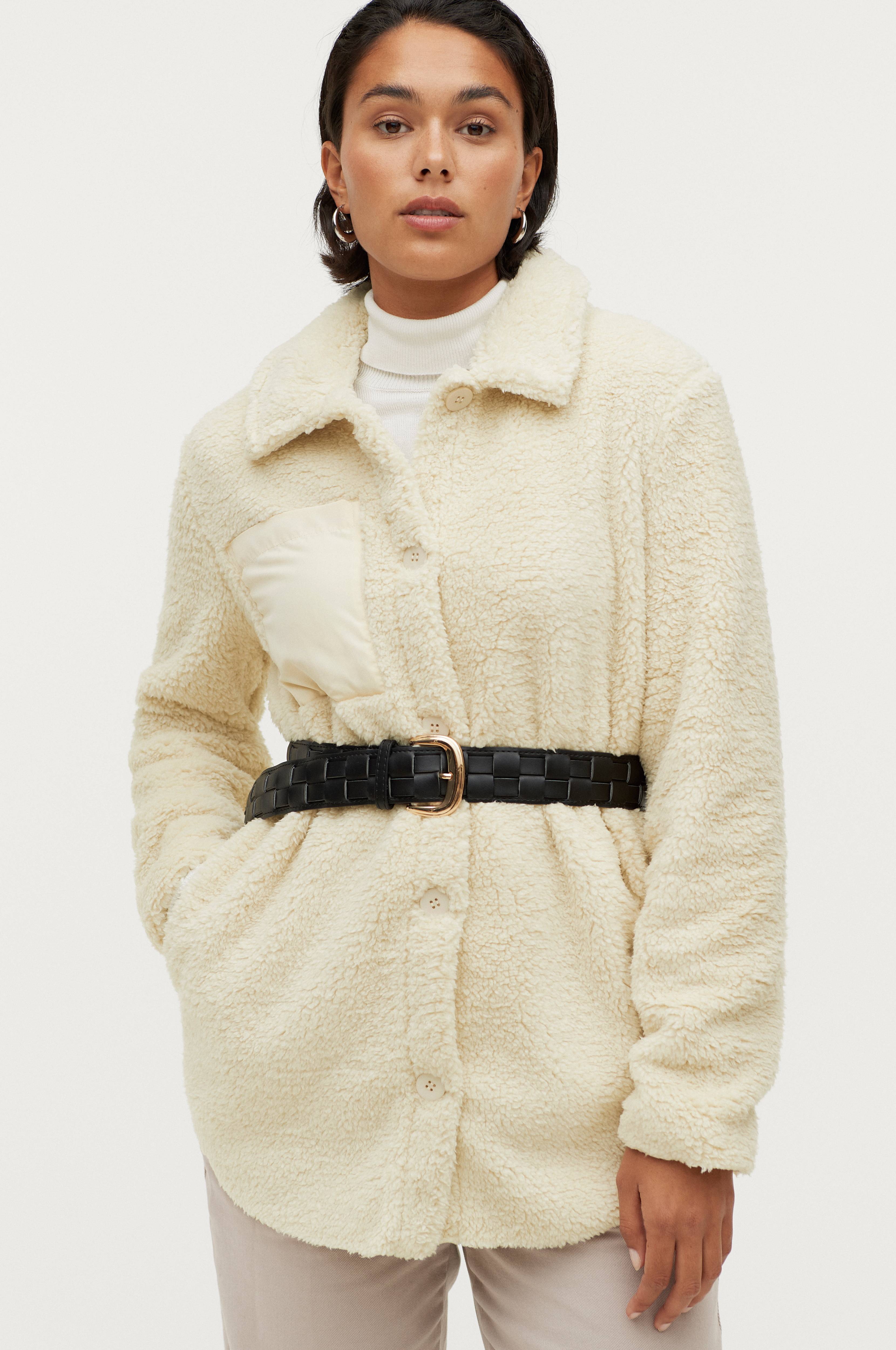 Jakke i blød plys med løs pasform. En påsyet brystlomme i vævet, let blankt stof. To sidelommer. Længde ca. 76 cm i str. S.