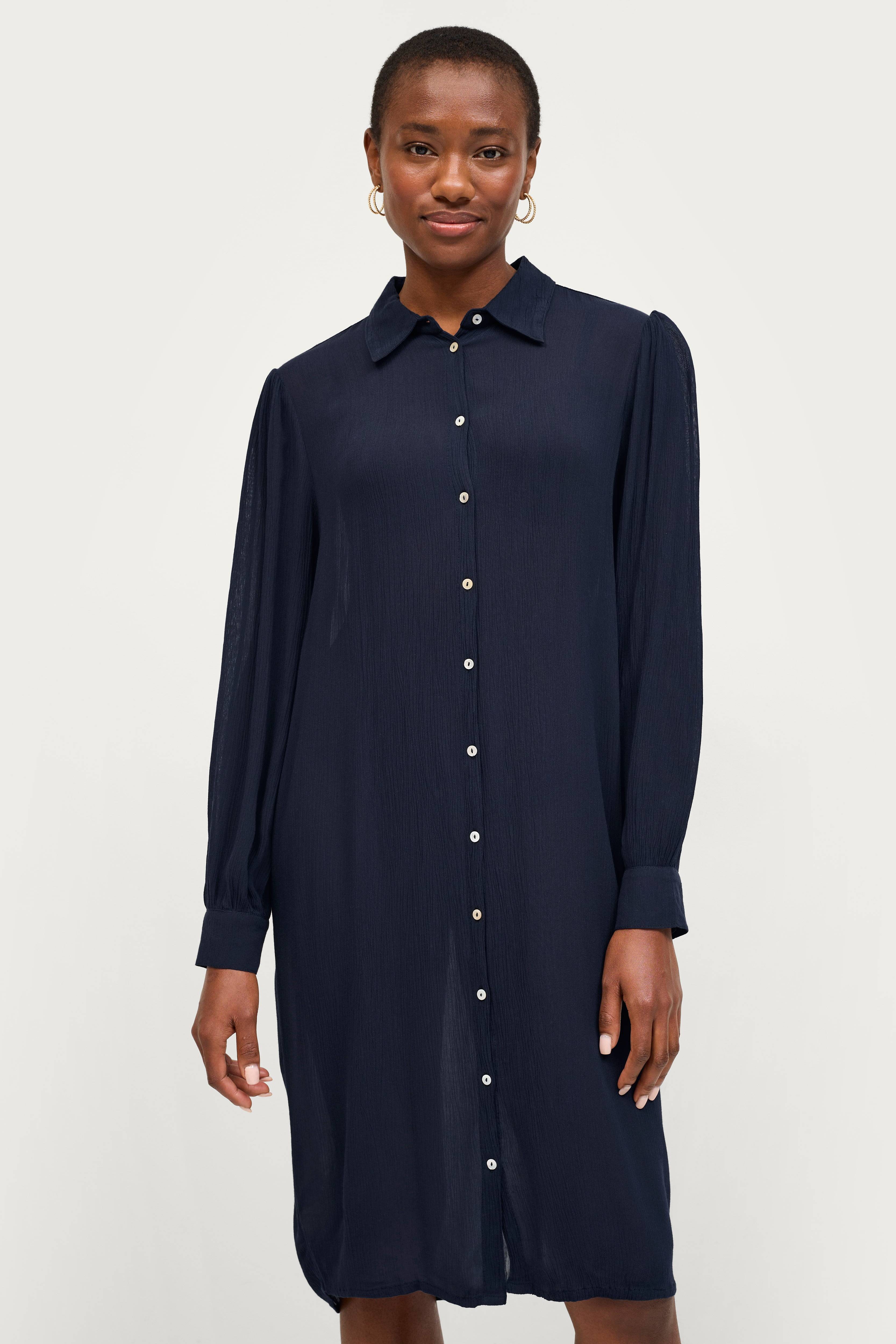 • Skjortekjole med midilængde• Løs pasform• Krave• Knapper hele vejen frem• Manchet med en knap• Stof med let struktur• Længde: 112 cm i størrelse 36