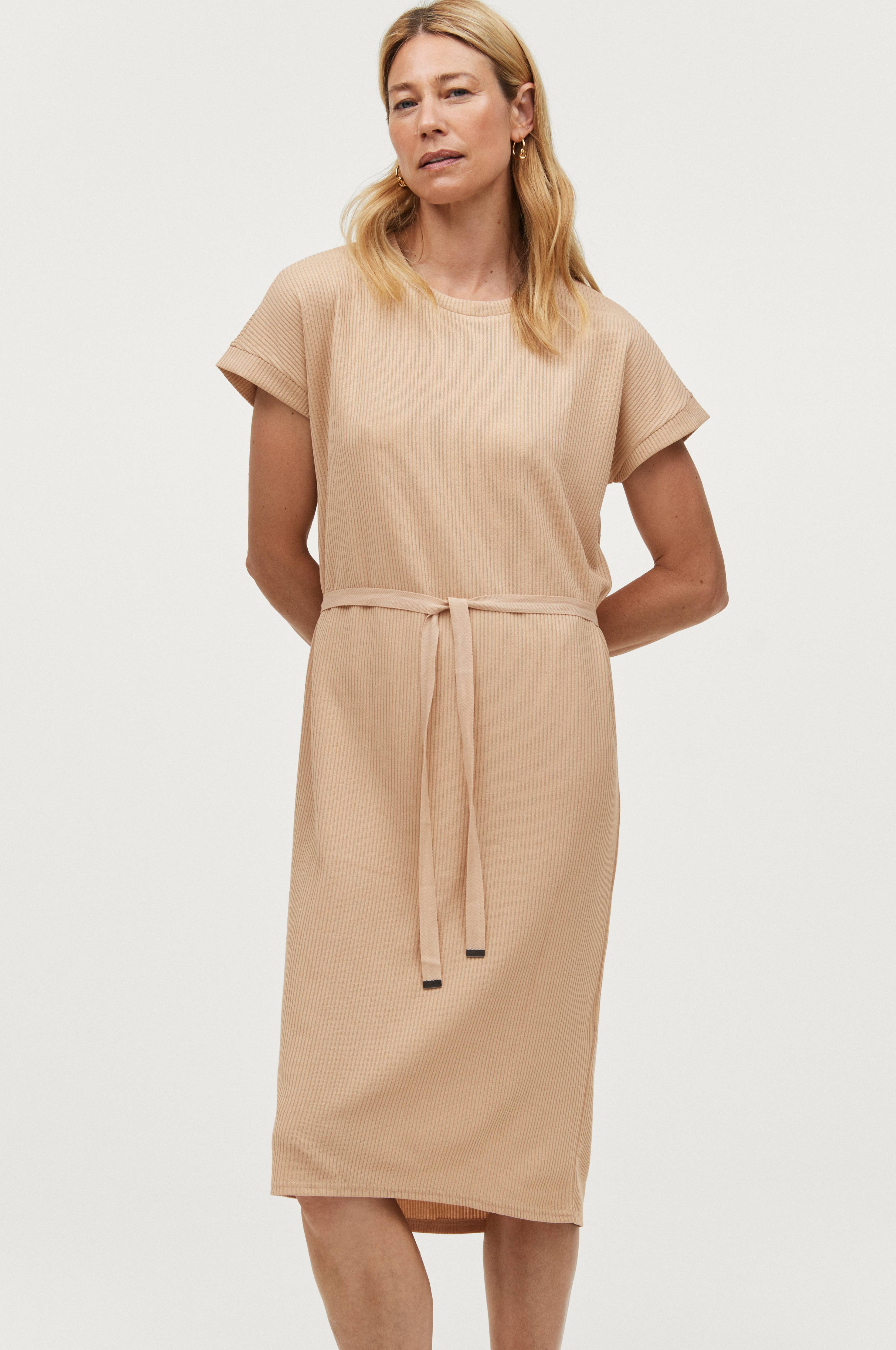 Kjole BeatheSZ SS Dress fra Saint Tropez. Lige model i ribstrikket jersey med lav skulder og kort ærme med påsyet kant i ærmekant. Rund hals med påsyet kant og små stropper med vævet bindebælte i taljen. Længde ca. 115 cm i str. S.