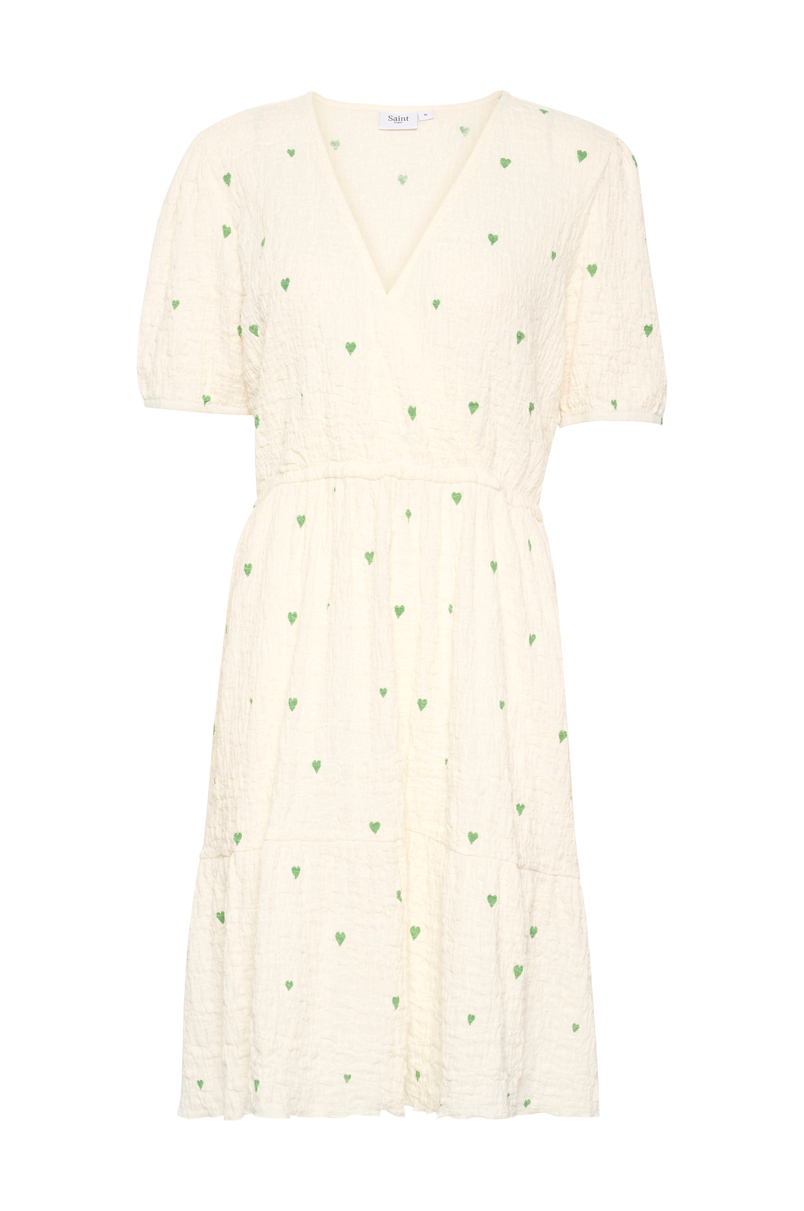 • V-udskæring med slå-om• Korte ballonærmer• Elastisk talje• Bølget kant nederst• Længde: 100 cm i størrelse S