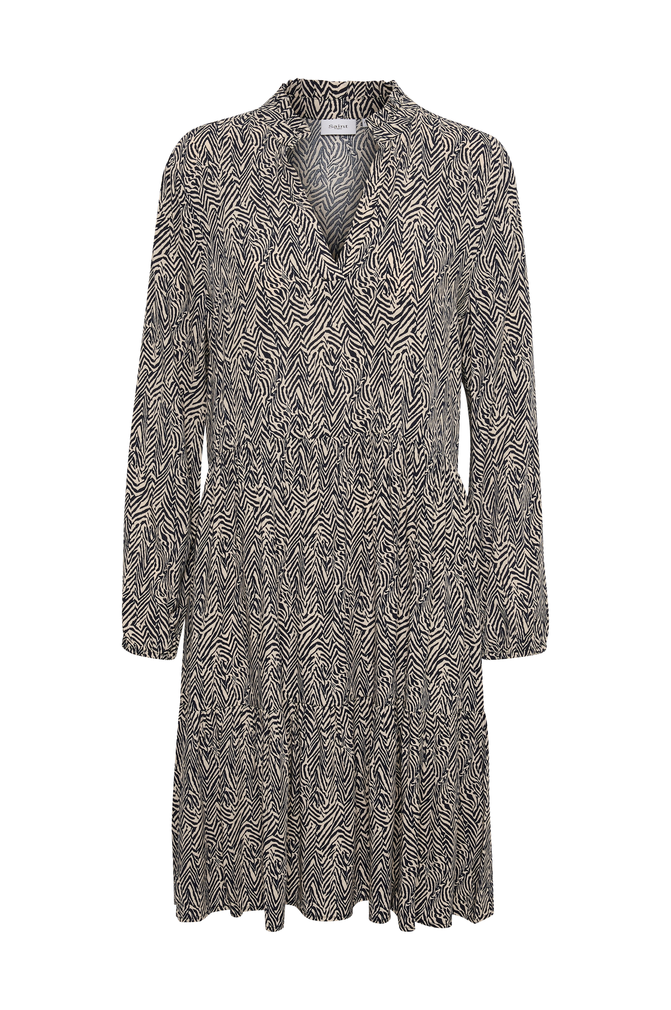 Kjole EdaSZ LS Dress fra Saint Tropez i løs, flæsesyet model med V-udskæring med lægget kant og langt ærme med elastisk ærmekant. I vævet kvalitet. Længde ca. 100 cm i str. S.