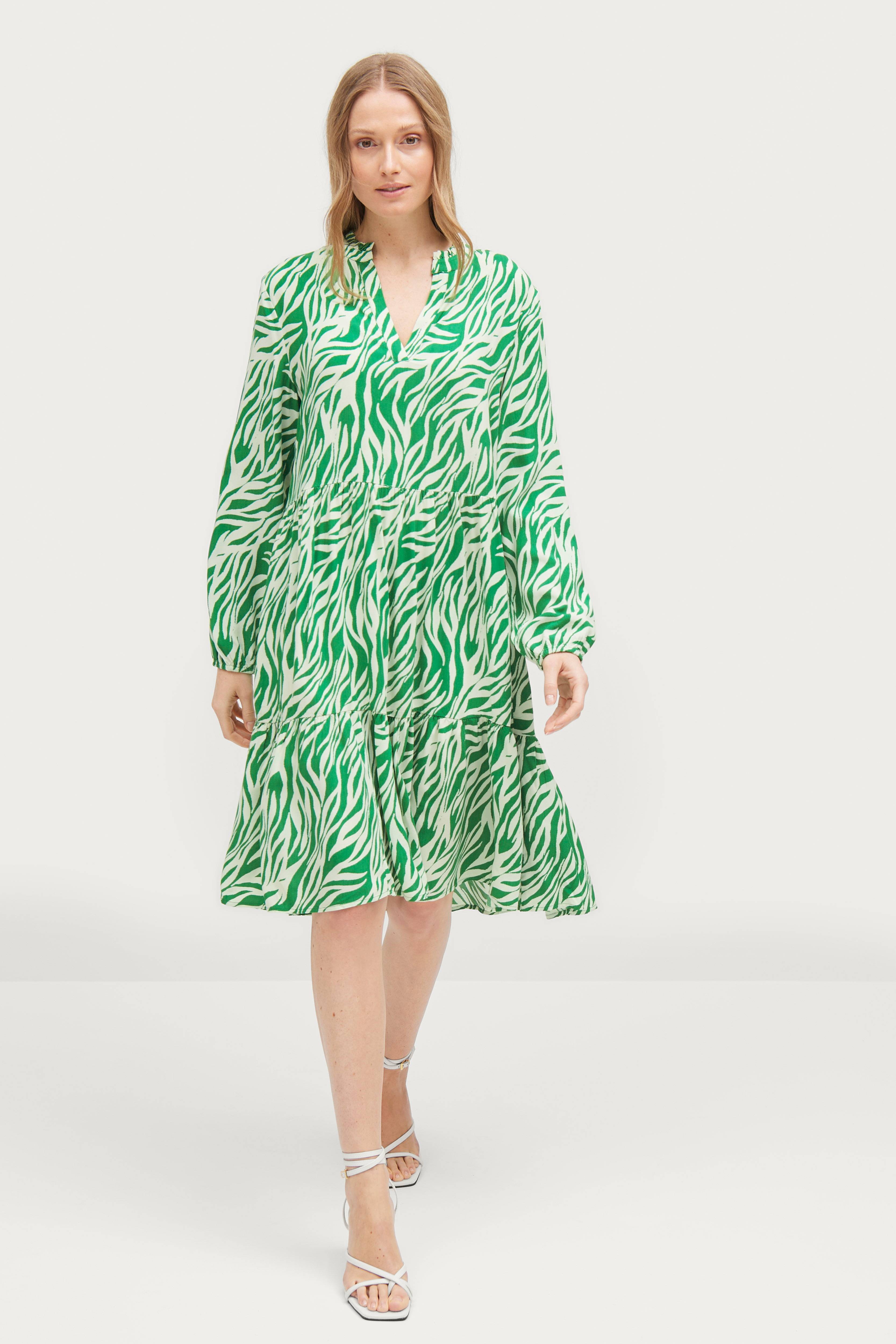 Kjole EdaSZ LS Dress fra Saint Tropez i løs, flæsesyet model med V-udskæring med lægget kant og langt ærme med elastisk ærmekant. I vævet kvalitet. Længde ca. 100 cm i str. S.