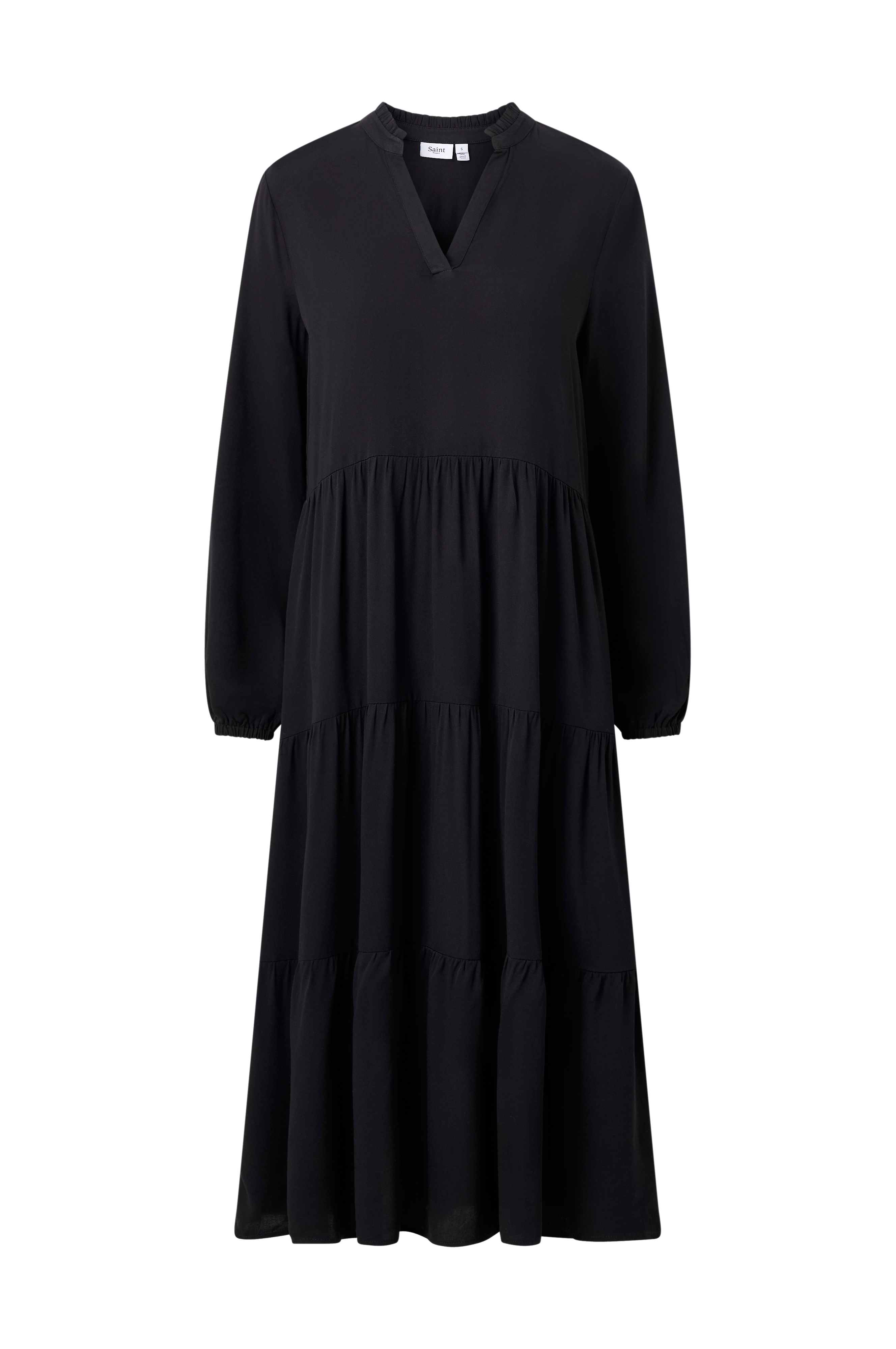 • Kjole i viskose• V-formet halsudskæring med flæsekant på toppen• Langt ærme med elastik ved manchetterne• Nederdel med svaj med volanter• Længde: 123 cm i størrelse S