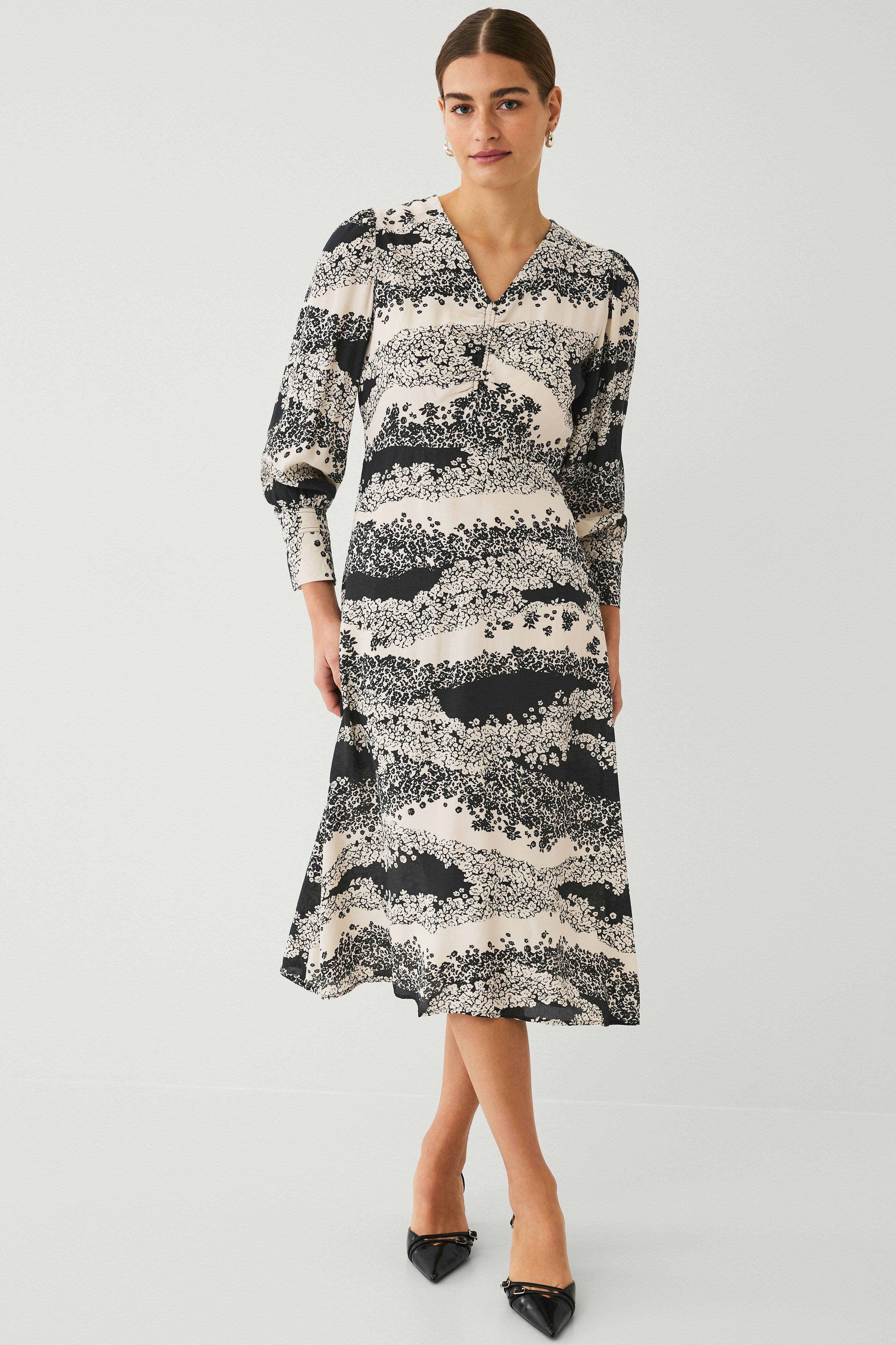 • Kjole i tynd viskose med mønster• Figursyet pasform med midilængde• V-formet halsudskæring med bølgeformet sømdetalje• Lange arme med manchet ved manchetterne• Lynlås i siden• Længde: 121 cm i størrelse S