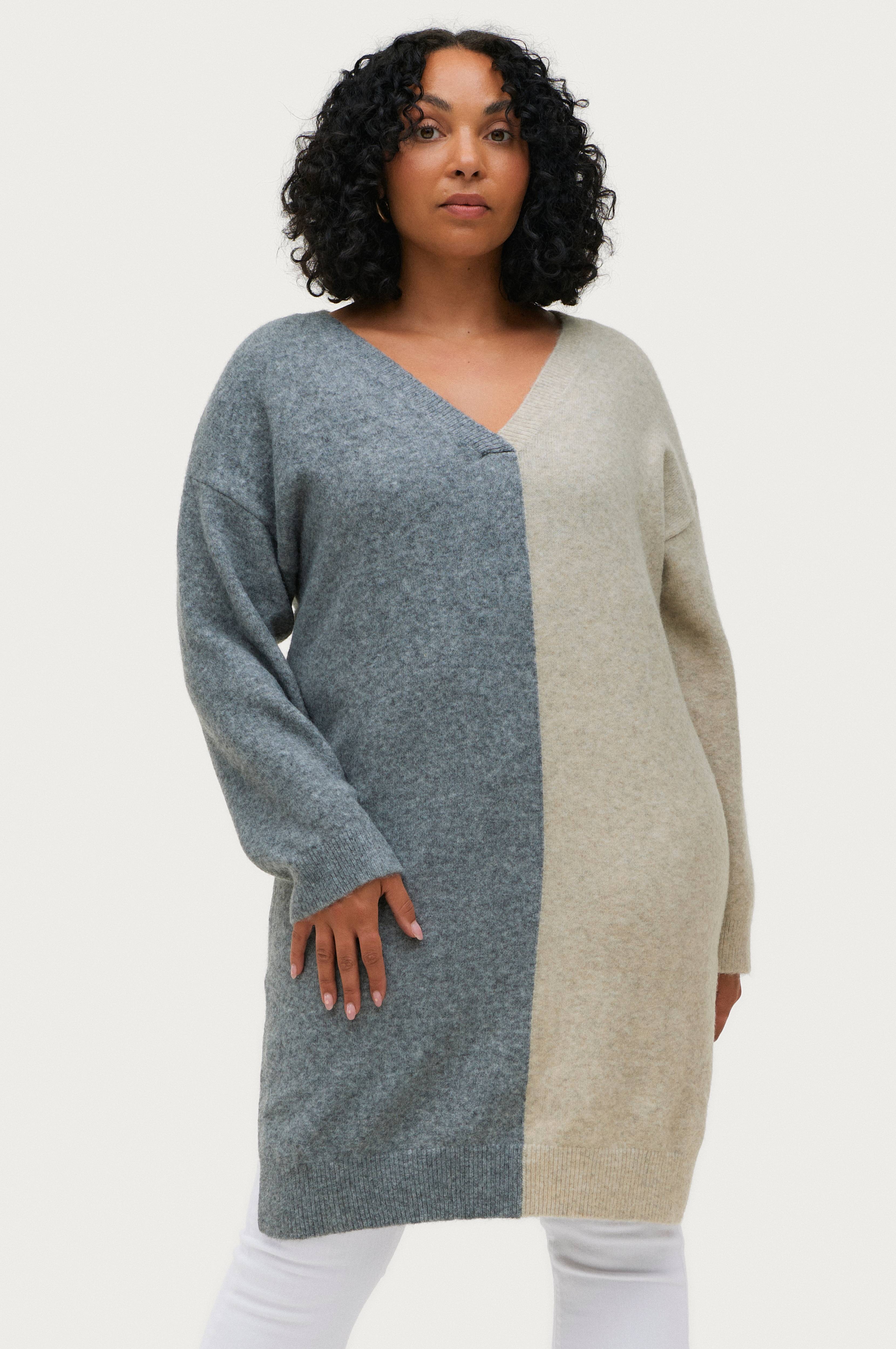 • Strikket kjole i uldblanding• V-formet halsudskæring med ribbet kant• Ribbede kanter ved manchetterne og nederst• Slidser nede i siderne• Længde: 95 cm i størrelse S