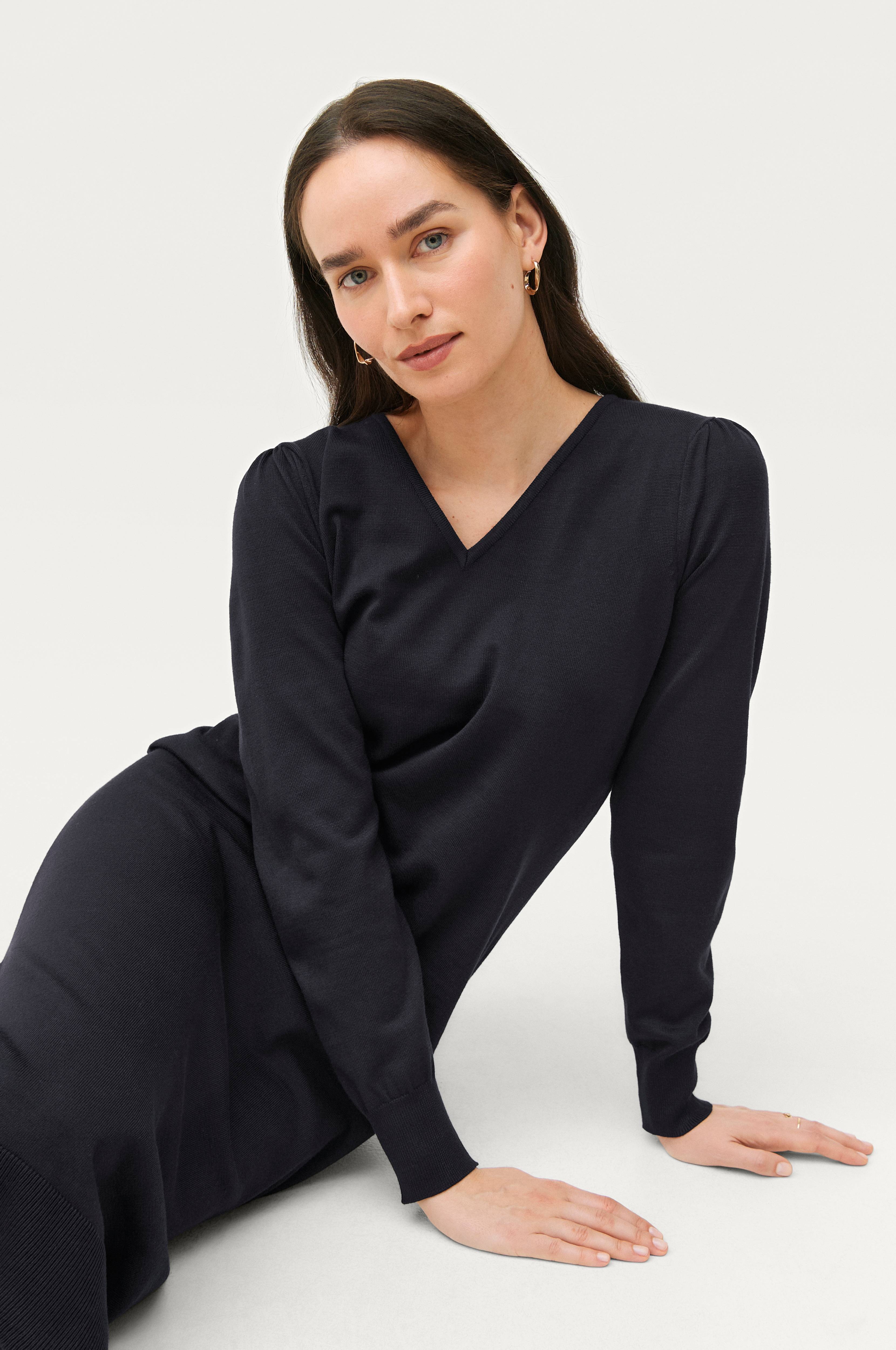 • Lige, fintstrikket model• V-formet halsudskæring• Langt ballonærme med ribstrik ved manchetterne• Slidser nede i siderne med ribstrikket kant• Længde: 114 cm i størrelse S