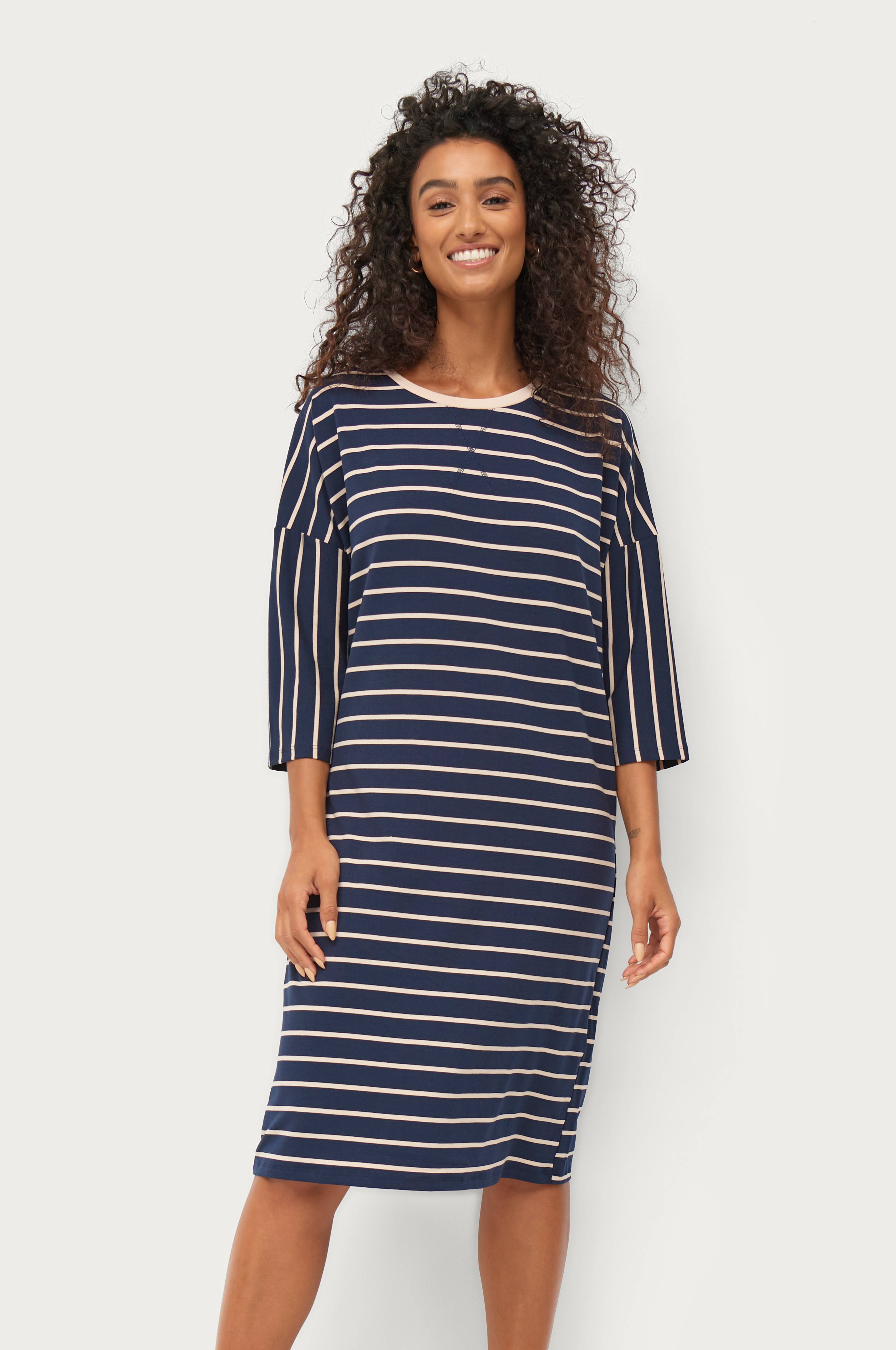• Stribet kjole i blød jersey• 3/4 lange ærmer• Nedsænkede skuldre• Lige pasform• Længde: 100 cm i størrelse S