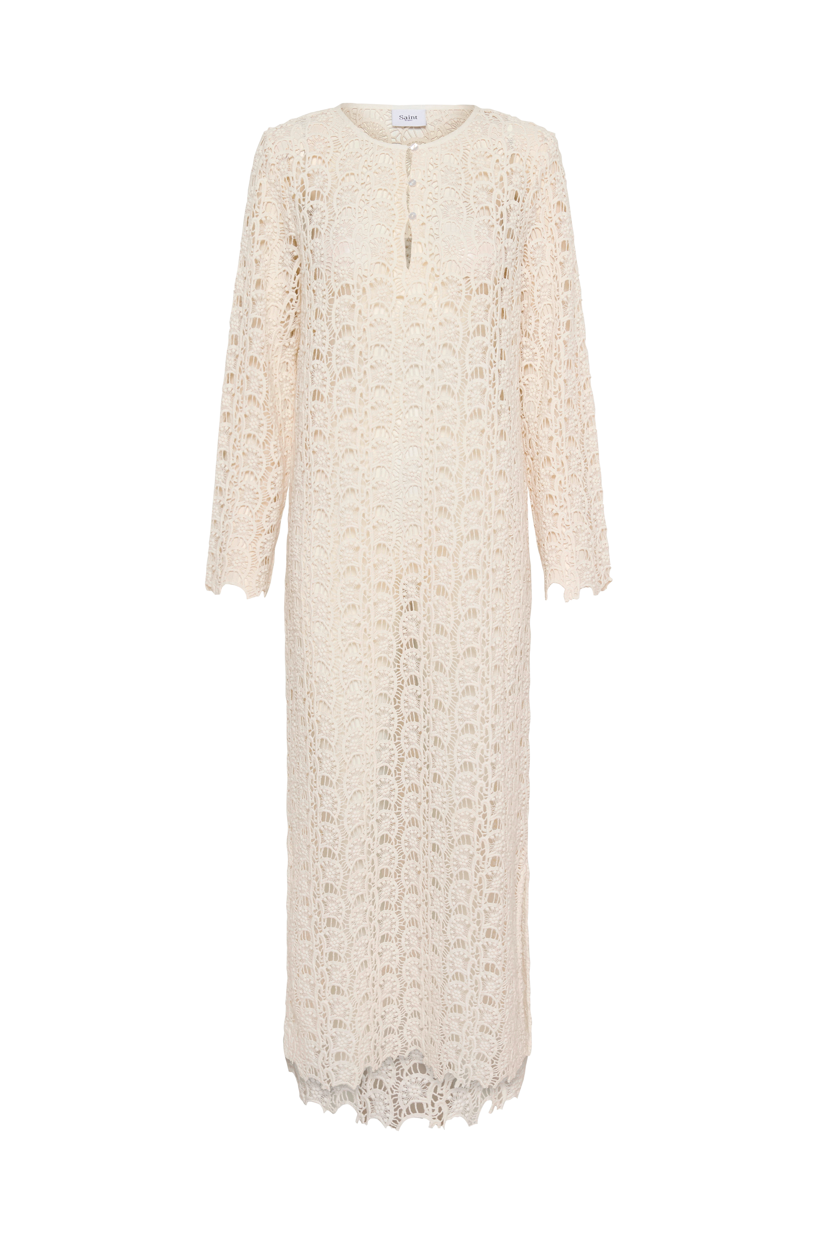 • Hulbroderet kjole• Rund halsudskæring• Kort knaplukning foran foran• Lange ærmer• Udtagelig underkjole• Slidser nede i siderne• Bølgede kanter• Længde: 126 cm i størrelse S