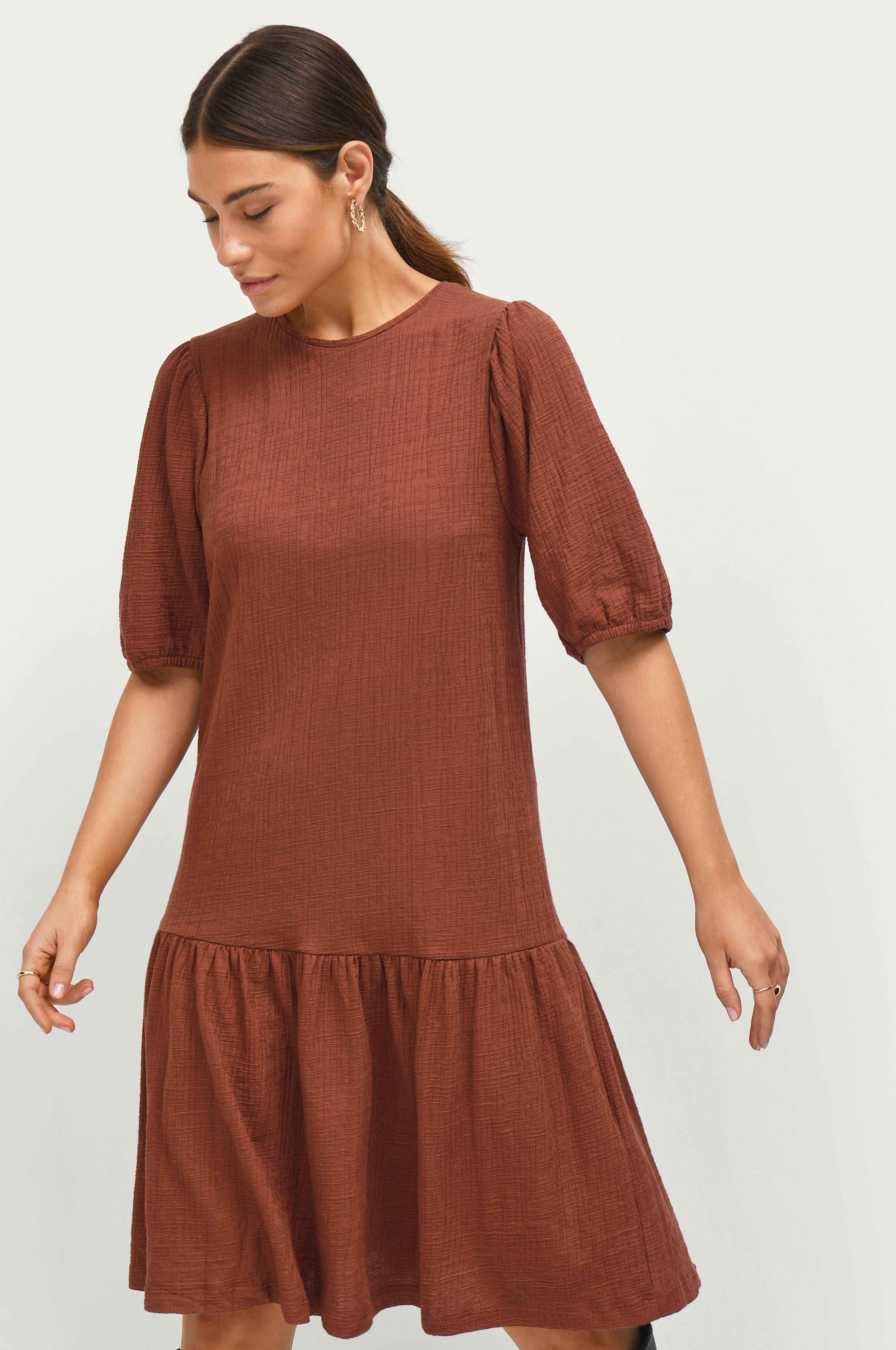 • Uformel model med svaj med bred volant nederst• Rund hals• Halvlangt ballonærme med elastisk manchet• Længde: 105 cm i størrelse S