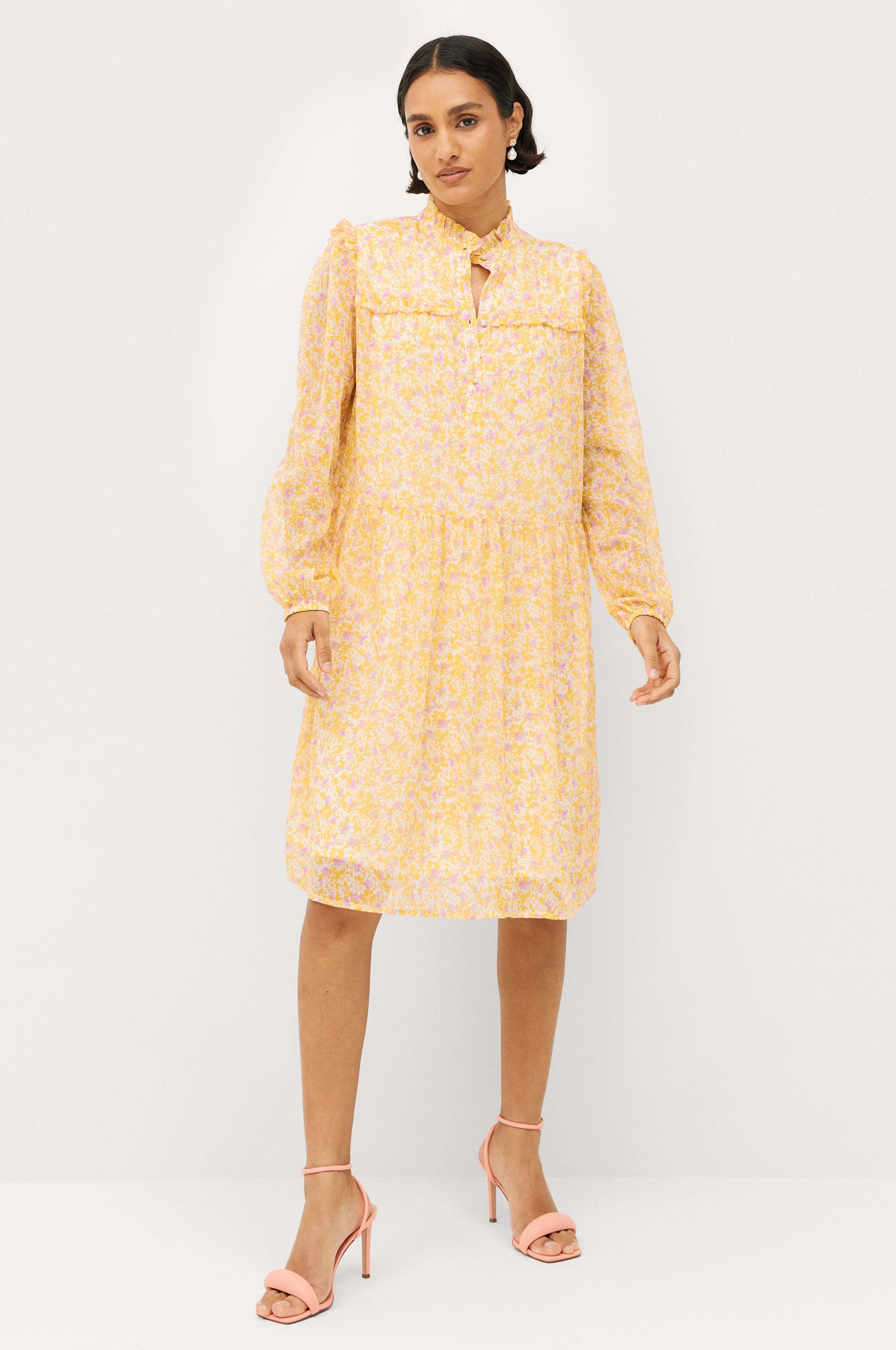 • Kjole i chiffon• Knapper oppe foran• Volant i halsen, ved brystet og på skuldrene• Transparente ærmer• Trikotfor• Længde: 99 cm i størrelse S