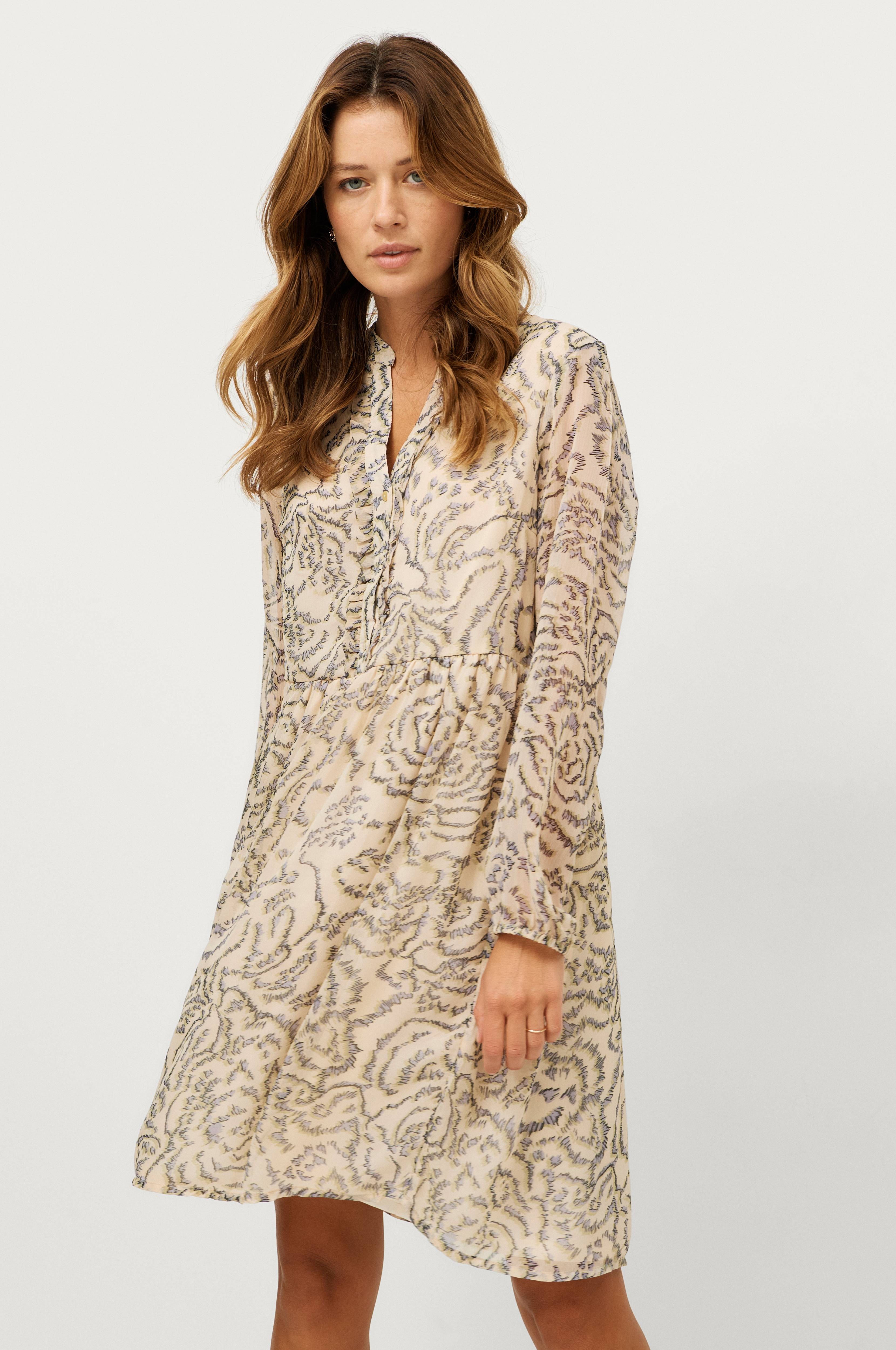 • Model med svaj i chiffon• Rund hals med v-udskæring foran og kort, flæset knaplukning foran• Langt ærme med elastisk manchet• Foret• Længde: 99 cm i størrelse S