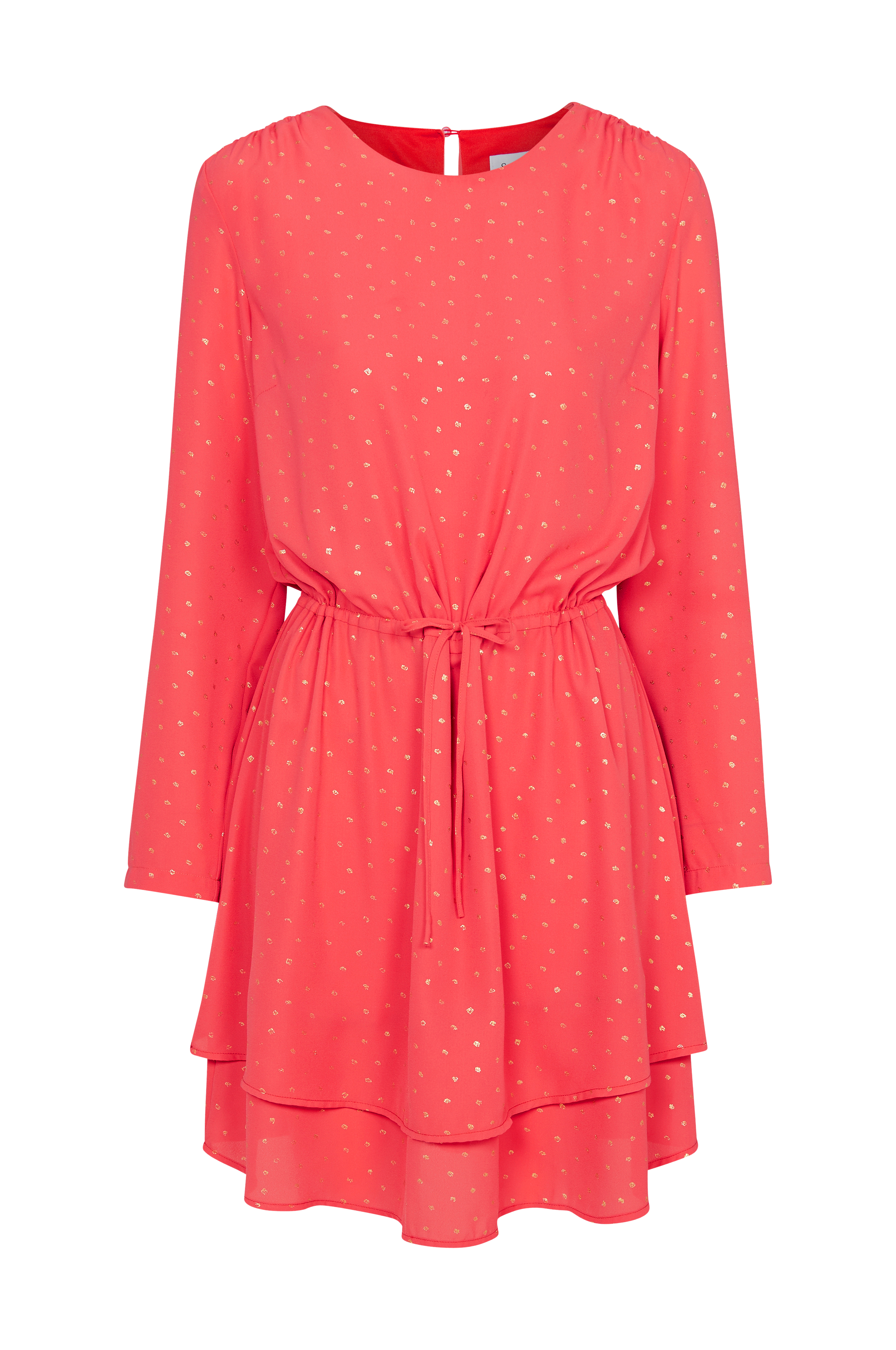 Kjole fra Saint Tropez. A-formet model med rynkning på skuldrene og afskæring med indsat løbegang i taljen. Rund hals med slids og knap i nakken samt langt ærme. Vævet kvalitet med glitrende prikker og blødt for i jersey som har vævet indsats i kanten forneden. Længde ca. 97 cm i str. M.
